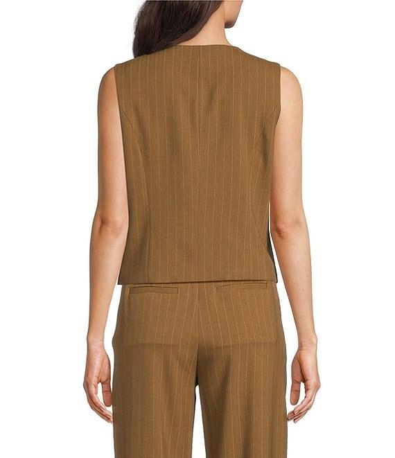 From Gibson & Latimer, this vest features: Vertical pinstripe Woven fabrication Round neckline Sleeveless Button front closure Pull on construction Front welt pocket detail Vest silhouette Fixed lining Split front hemline Average length Approx. 25.25" HPS in length Polyester, rayon, spandex Professional dry cleaning only Imported. Dillard's Exclusive