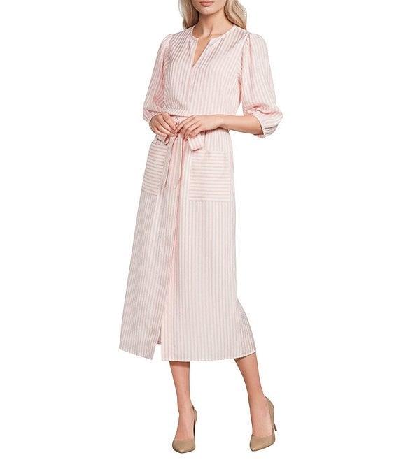 From Gibson & Latimer, this skirt features: Seersucker fabrication Stripe print Regular rise waist Self-tie belt A-line silhouette Fully lined Straight hemline Midi length Pull-on construction Approx. 17.25" HPS in length Cotton/spandex Machine wash on cold cycle; wash with similar colors and fabrications; promptly remove from wash/tumble dry on low; use cool steam iron if needed. Imported. Dillard's Exclusive.