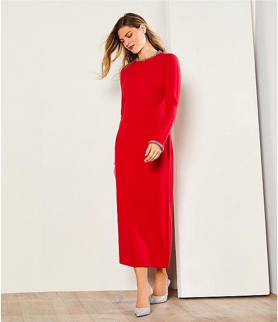 From Gibson & Latimer, this dress features: Wool blend knit fabrication Round neckline with contrast beaded detail Long sleeves with contrast beaded cuff detail Shift silhouette Modern fit Straight hemline Midi length Back keyhole with button closure Approx. 49.5" HPS in length Polyester/acrylic/polyamide/wool Hand wash Imported. Dillard's Exclusive