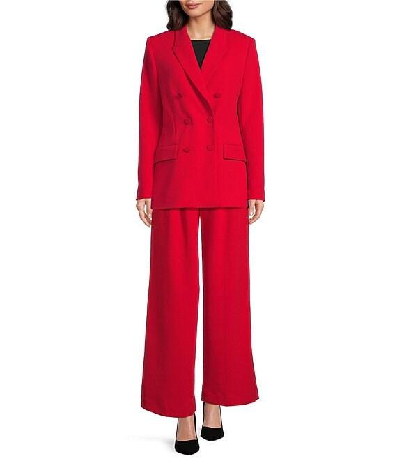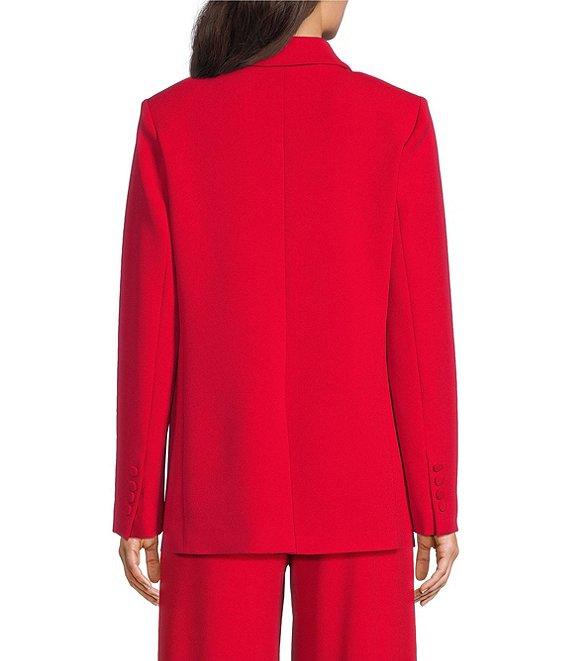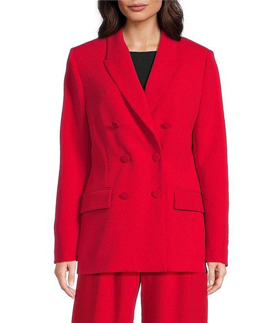 From Gibson & Latimer, this blazer features: Woven fabrication Notch lapel collar Long sleeve Double breasted silhouette Oversized fit Fully lined Side flap welt pockets Straight hemline Mid length Button front closure Approx. 27.5" in length Polyester/spandex Turn garment inside out prior to wash, machine wash on cold gentle cycle, wash with similar color and fabrication, tumble dry on low, use cool iron on low if needed. Imported. Dillard's Exclusive