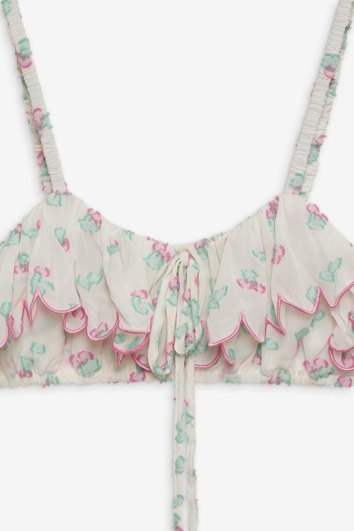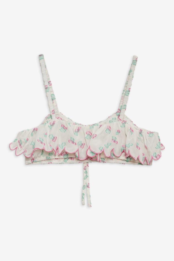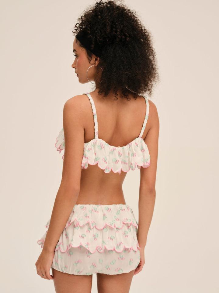 Inspired by iconic vintage silhouettes, the Gidget pink and white bra top evokes a charming summertime feel. Featuring a ruffle neckline and scrunchie shoulder straps, this crop top is crafted in a light cherries and cream-printed fabric and adorned with a center-front tying bow.
