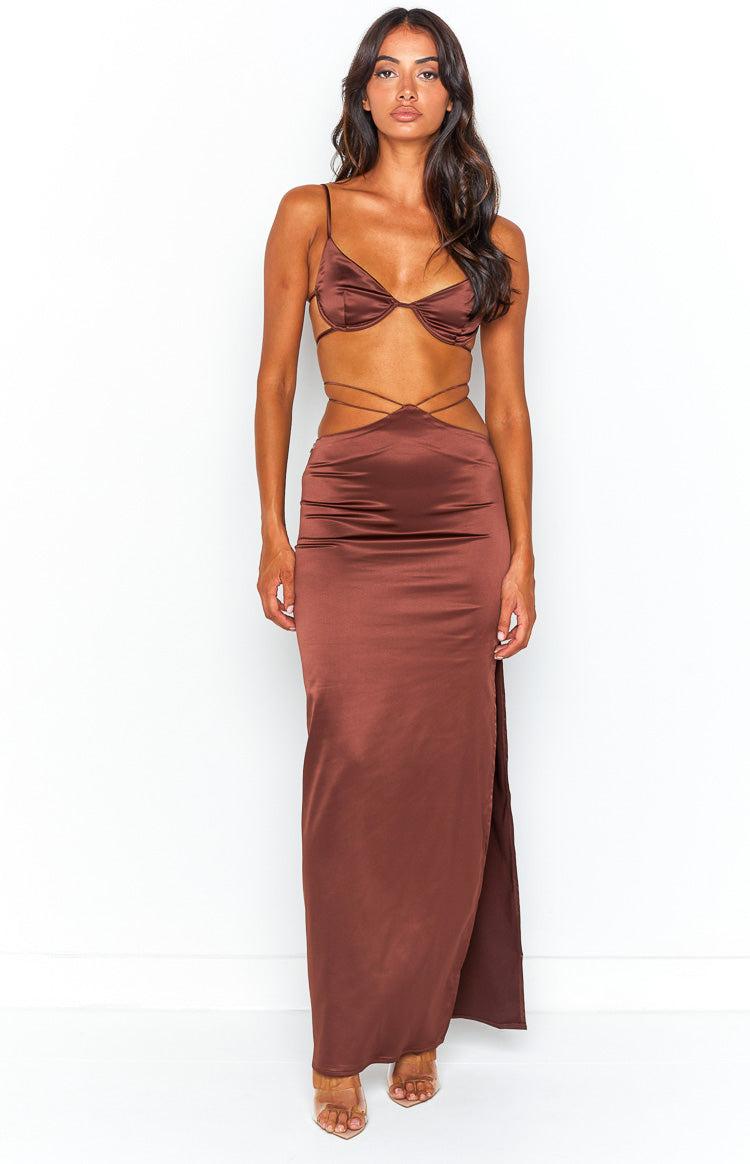 Gigi Brown Maxi Skirt The details on this skirt! The Gigi Maxi Skirt is perfect for those nights out with the girls! Style with the Maffie Crop Top and heels for that elegant but sexy look! Maxi length Waist tie detail Invisible zip with hook and eye fastening on right side 3/4 leg split on left side Unlined Light-weight material with no stretch