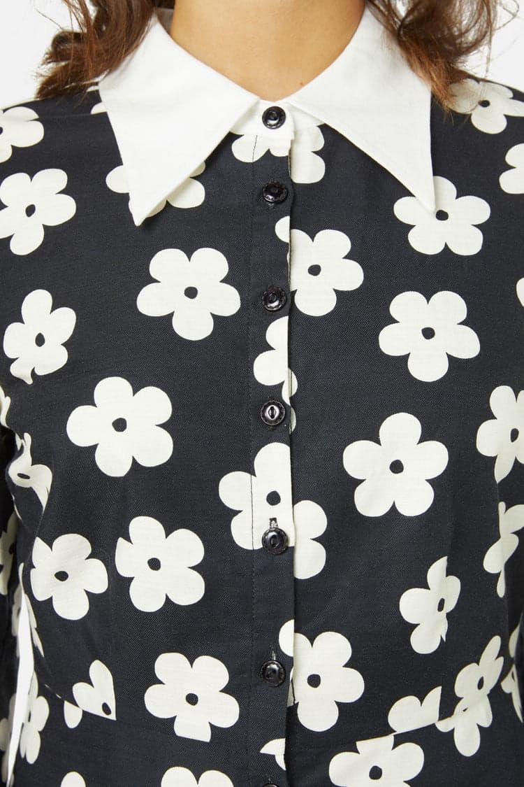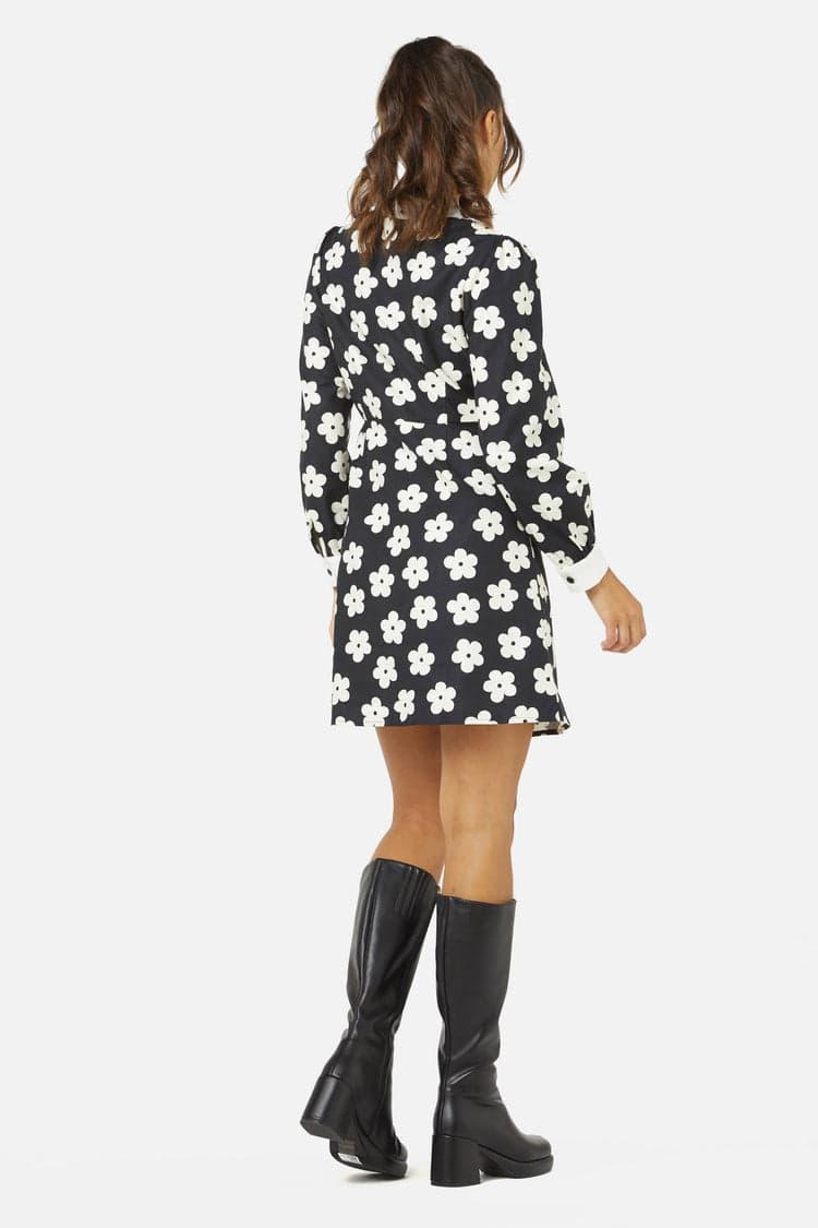 Step into a realm where fashion takes a playful leap back in time with the Daisy Shirt Dress by Princess Highway. Picture this: a design that captures the essence of the spirited '60s, adorned with a minimalist daisy print that's both adorable and unmistakably groovy. It's not just a dress; it's a statement of joy and nostalgia intertwined. The contrasting collar and cuffs add a snippet of surprise, framing the button-down front that traces elegantly down to a smartly fitted waist. Here, thoughtful darts at the bust and waist craft a silhouette that's as flattering as it is comfortable. The dress then flares into an A-line skirt, recalling days of jaunty dances and uninhibited laughter. Long sleeves, accented with contrast-colored cuffs, complete the ensemble, offering a snug embrace. Available in a classic black that's as versatile as it is timeless, this dress promises to be your go-to for whimsical weekend outings, quaint coffee shop encounters, or any day you wish to sprinkle a bit of fun and flair into.95% ORGANIC COTTON 5% ELASTANECold delicate machine wash Wash garment inside out Wash with like colors Do not wring or spin Do not bleach or soak Do not tumble dry Line dry in shade Warm iron on reverse if required Do not dry cleanImported