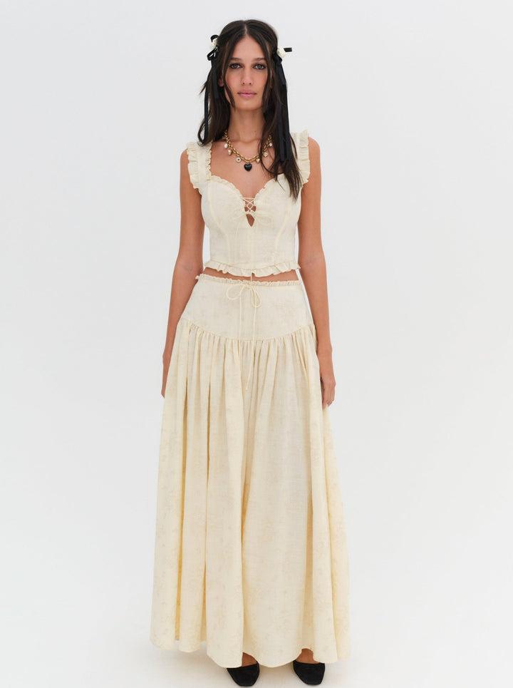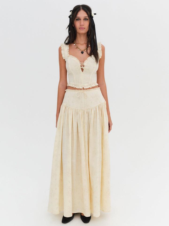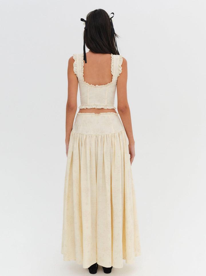 Inspired by vintage linens that dry beneath the summer sun, the Gigi cream maxi skirt has a perfect vintage look and feel. Crafted in heavy linen, this long skirt is embroidered with tonal florals and features a drop waist with a contoured yoke.