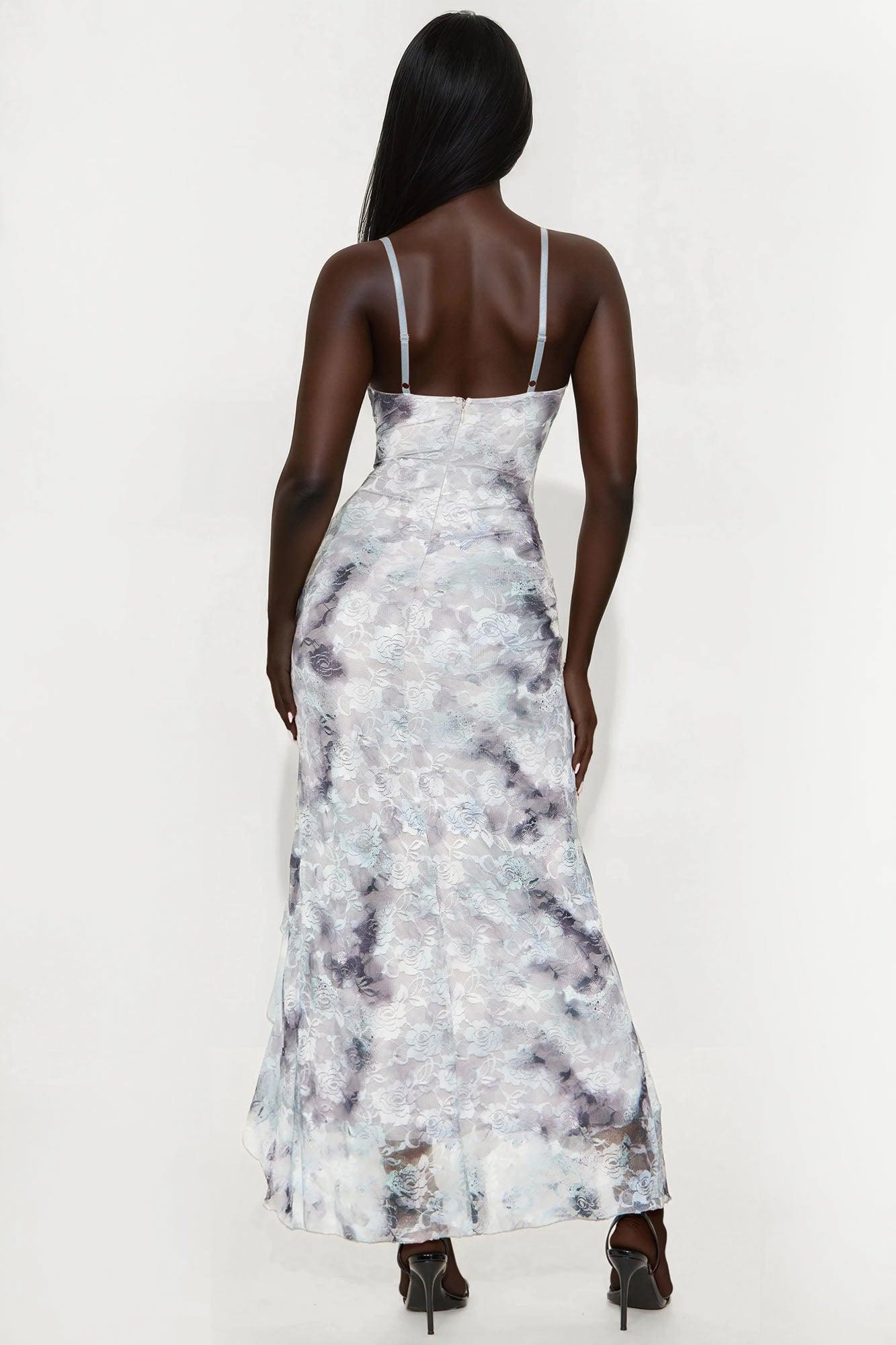 Available In Grey/combo. Lace Maxi Dress Adjustable Spaghetti Straps Cowl Neckline Padded High Slit Ruffle Hidden Back Zipper Lined Stretch Disclaimer: Due To The Specialized Dye Process, Each Garment Is Unique Self & Lining: 95% Polyester 5% Spandex Imported