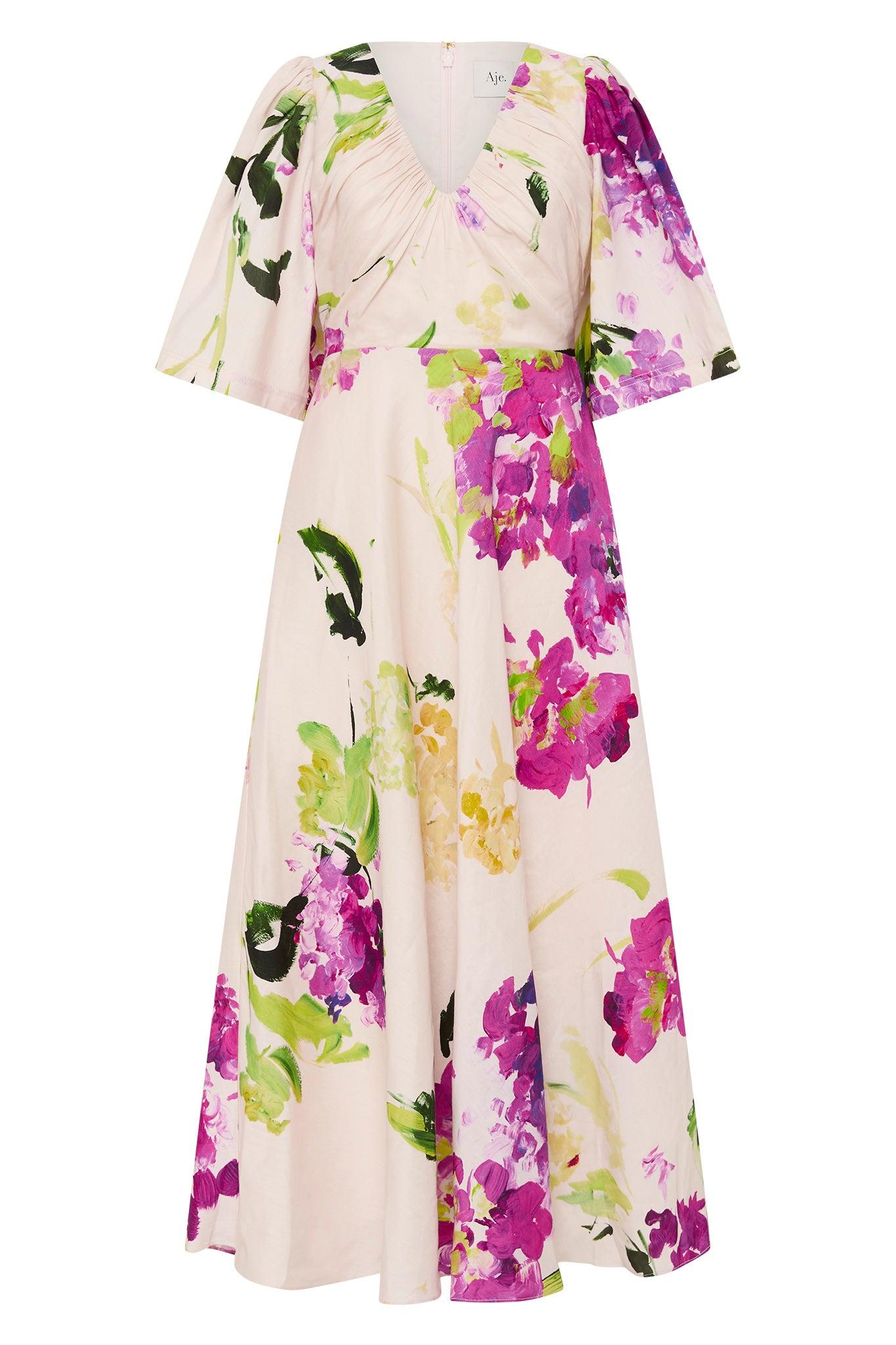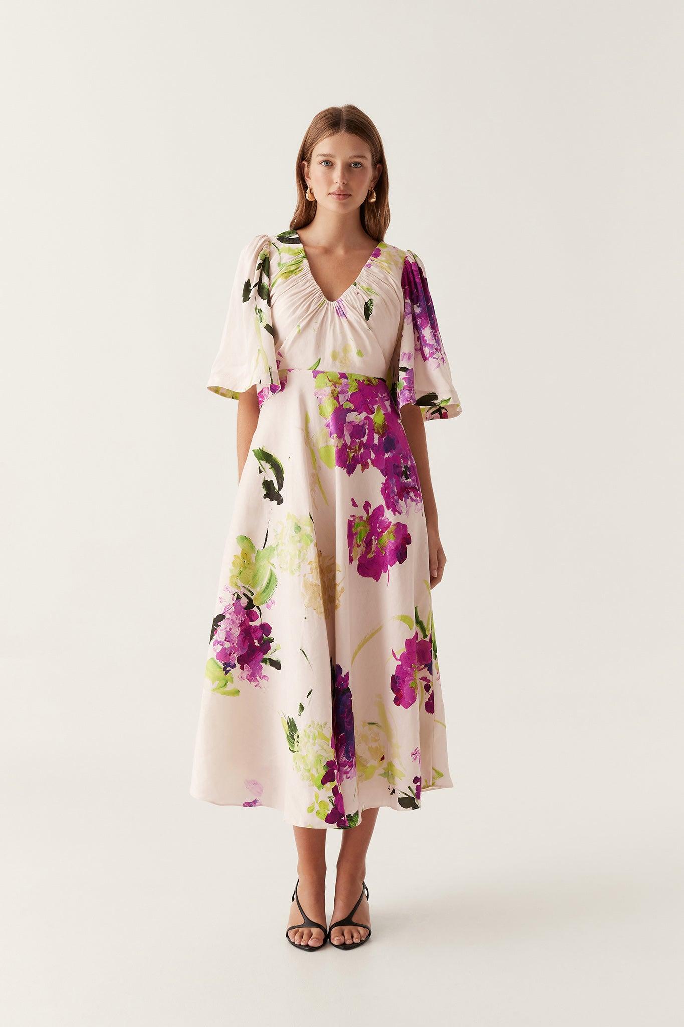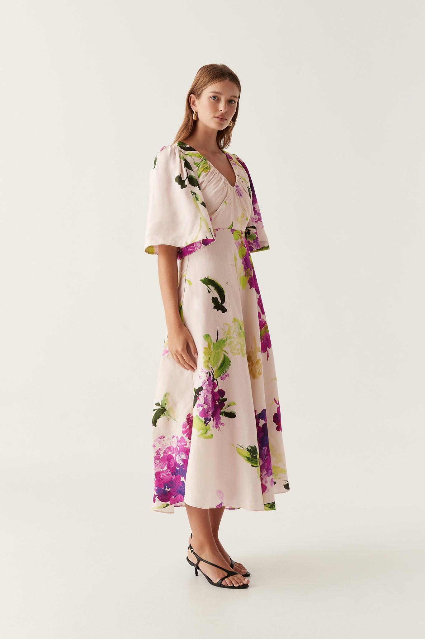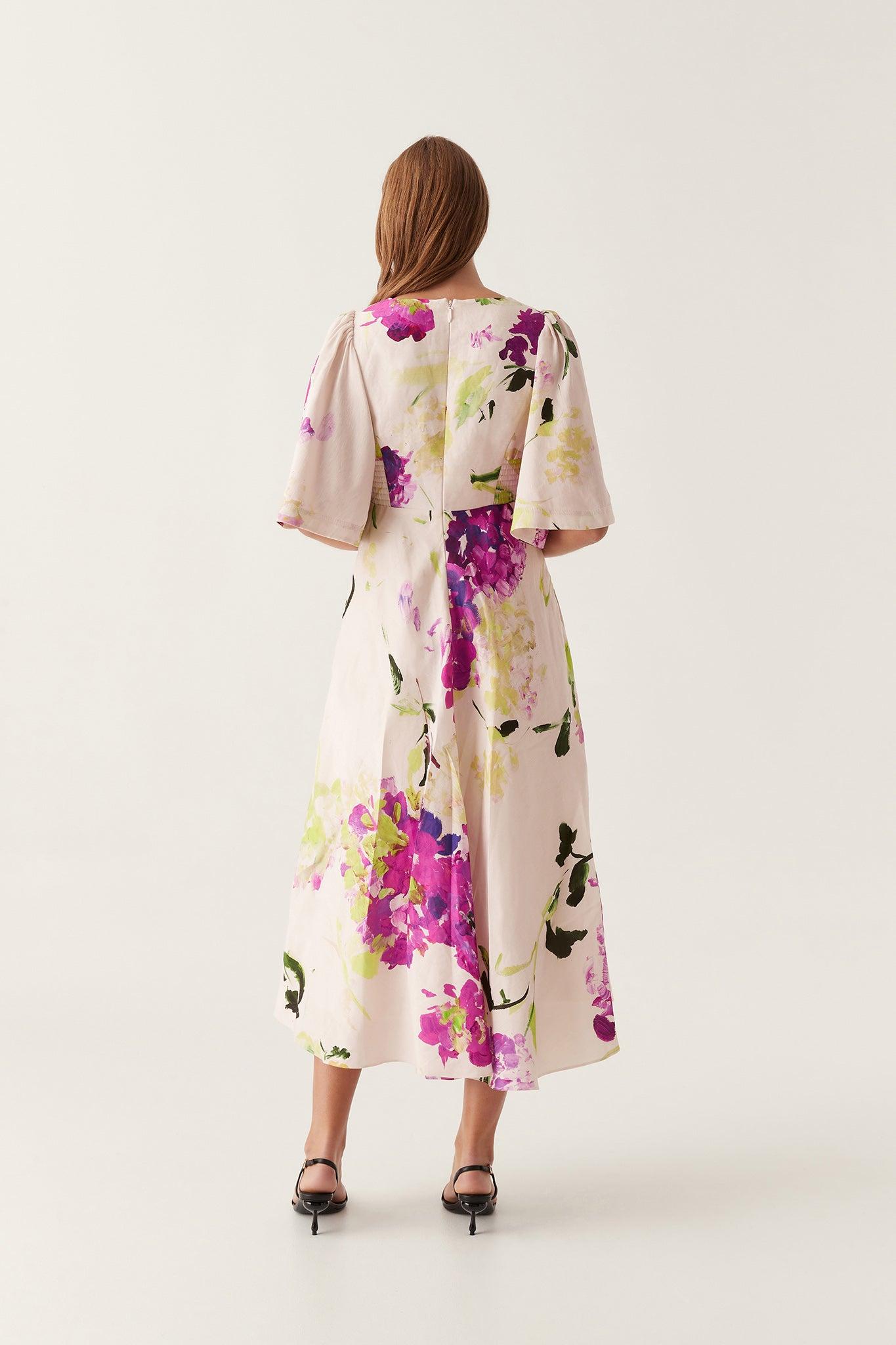 PRODUCT DETAILS Exclusive, unique print placement on each piece Women’s midi dress Curved V-neckline Gathered bodice Wide bell sleeves Fitted waist A-line skirt Side pockets Zip, hook and eye closure Lined Shop All Dresses SIZE AND FIT Model wears a size AU 8/S Model: 179cm/5’10 Bust: 81cm Waist: 61cm Hips: 86cm FABRICATION 69% Linen 31% Viscose Dry clean only