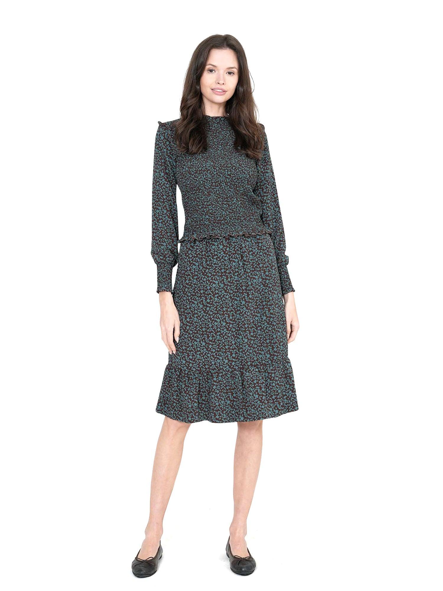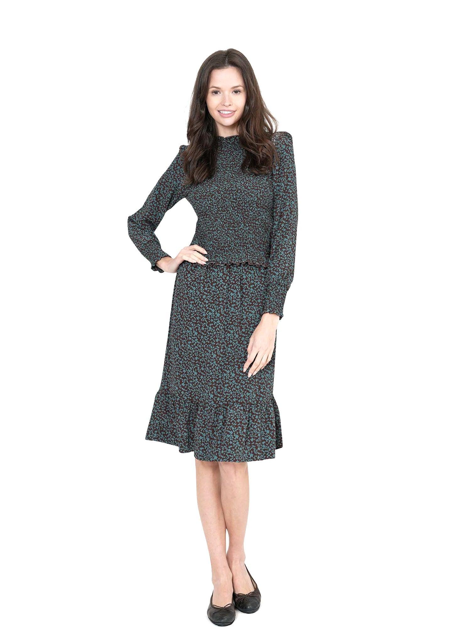 This smocked, long sleeved top is one you’ll wear on repeat. There is a small ruffle on the collar and around the shoulder area. Body and bottom of the sleeve is smocked. Soft crinkle fabric. Perfect to wear with high rise bottoms or with the matching skirt.•FABRIC: Soft to the touch•FIT: Classic•STYLE/OCCASION: Day to night wear.•GARMENT CARE: Machine wash cold•FABRIC CONTENT: 100% Polyester