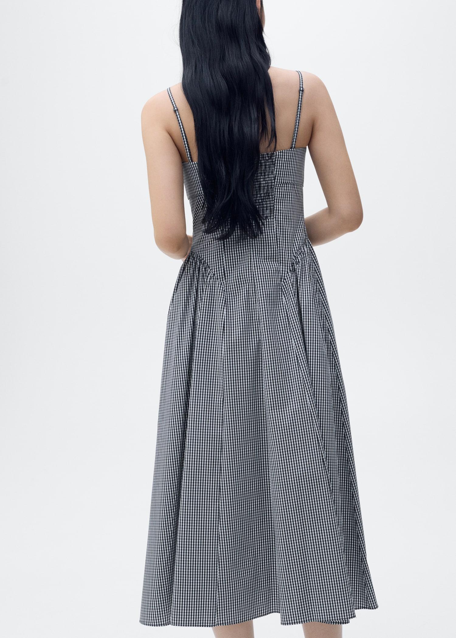 Cotton blend fabric. Midi design. A-line design. Gingham check print. Low neckline. Runched detail in the neckline. Sleeveless. Thin adjustable straps. Gathered detail at the waist. Elastic ruched panel at back. Side zip closure. Online Exclusive. Side length 40.39 in. Back length 39.76 in