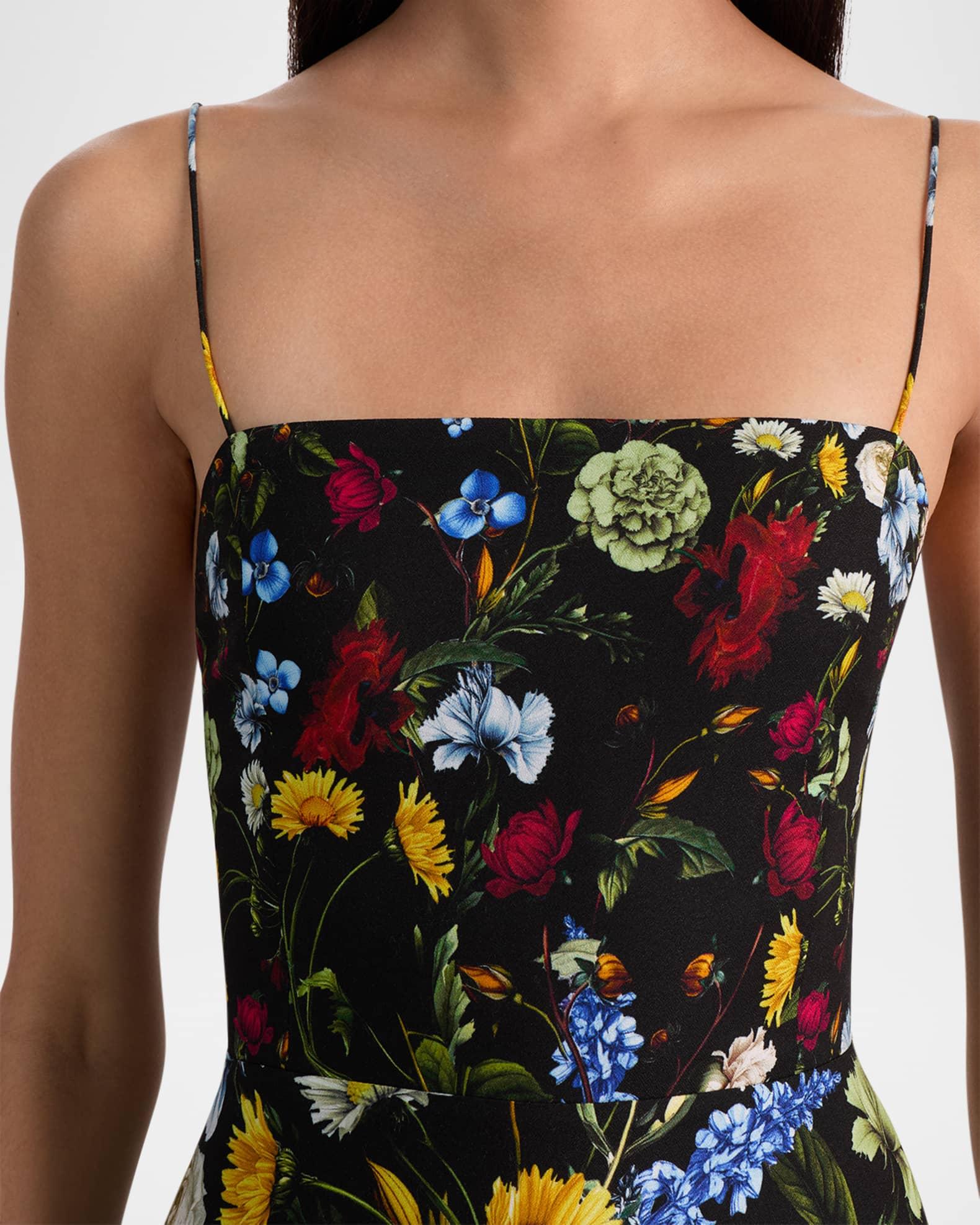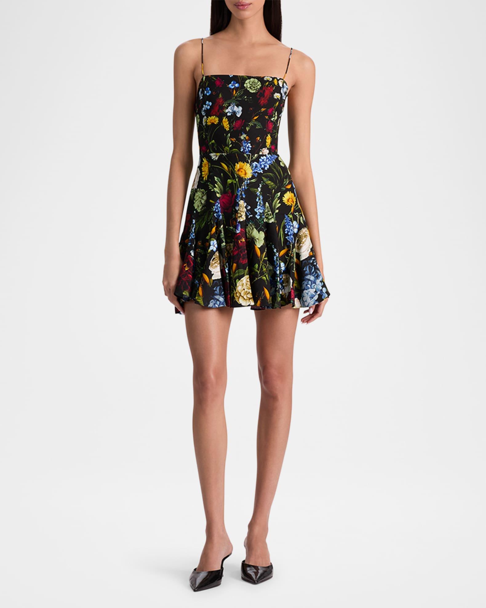 Printed with vibrant floral blooms, the Ginny dress by Alice + Olivia is framed with dainty spaghetti straps for an ultra-feminine silhouette Approx. 32.5"L from shoulder to hem Square neckline Sleeveless Hem falls above the knee A-line skirt Smocked back panel with center zipper Viscose Lining: Recycled polyester/elastane Dry clean Imported
