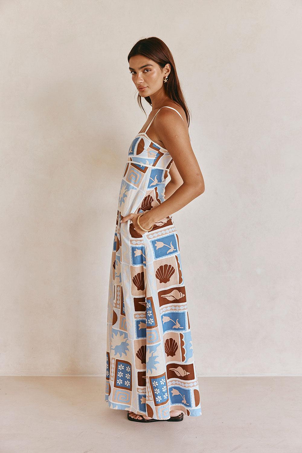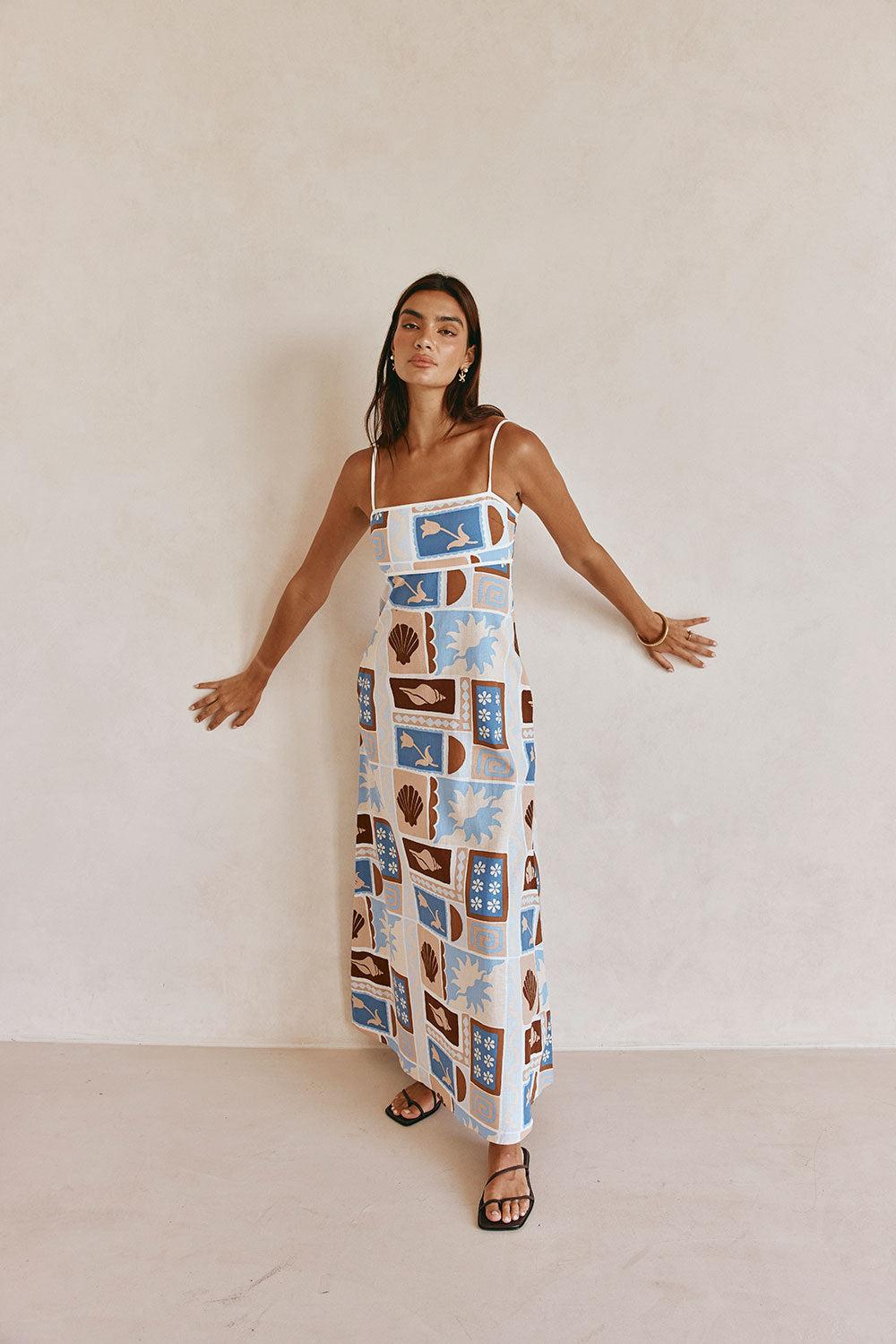 Introducing our new exclusive Solis print, the Giorgia Dress is made from a natural linen cotton blend fabric. It features thin adjustable straps, twin pockets and an a-line maxi skirt. Dress it up with the Bobbi Heels! Designed exclusively by Sabo.