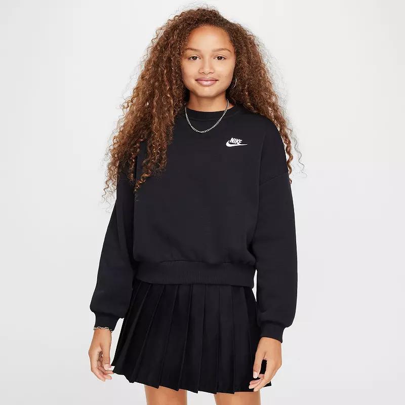 Always cool. Always comfortable. Our Club Fleece favorites are closet staples you can wear again and again. Smooth on the outside and brushed soft on the inside, this lightweight fleece sweatshirt is an easy layer when you want a little extra warmth. Baggy through the body with a slight crop, it offers room to move without feeling too big. Product Details:Body: 80% cotton/20% polyester. Rib: 97% cotton/3% spandex. Embroidered Futura logo. Ribbed cuffs, collar and hem. Machine wash. Imported. Style: FZ9244; Color: Dark Grey Heather/White; Size: L; Gender: Female; Age Group: Kids | Nike Sportswear Club Fleece Girls Boxy Crew-Neck Sweatshirt in Grey, Size: Large | FZ9244-063