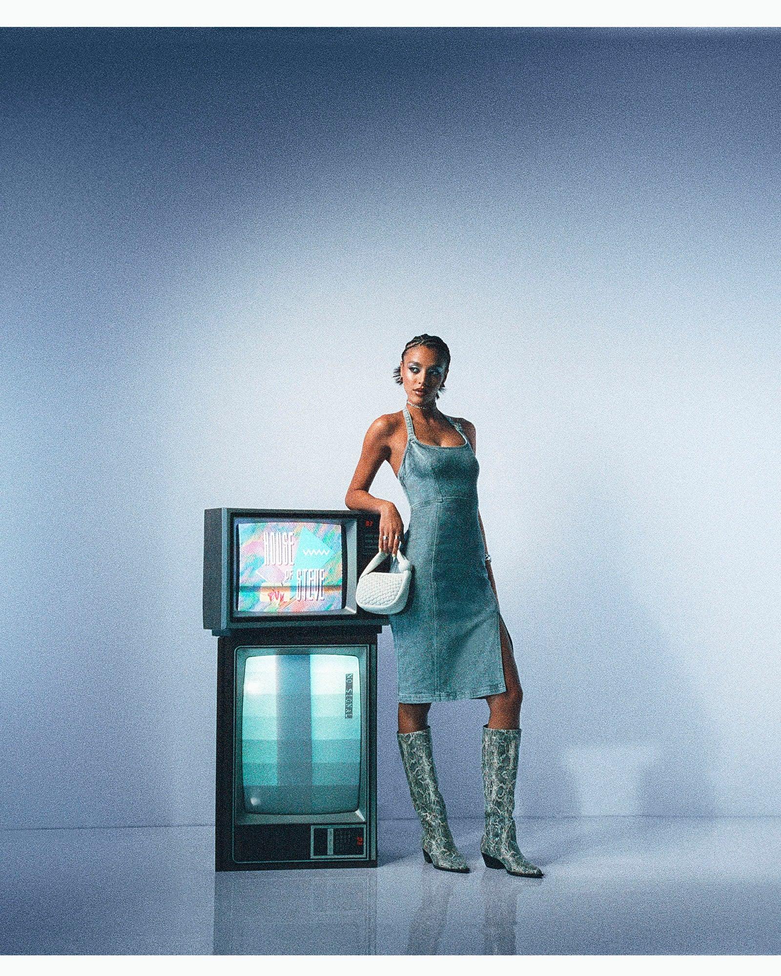 Upgrade your wardrobe with the GISELLE dress. This fitted midi dress features adjustable straps and an exposed back zip closure for a perfect fit. Made from high-quality blue denim, this dress is both stylish and comfortable. Denim fitted midi dress with slit Stretch fabric Zipper closure Adjustable straps Length: 45" 95% cotton 4% polyester 1% spandex Hand wash Stephanie is 5ft 10in and is wearing a size 12 Alex is 5ft 11in and is wearing a size 4 Imported