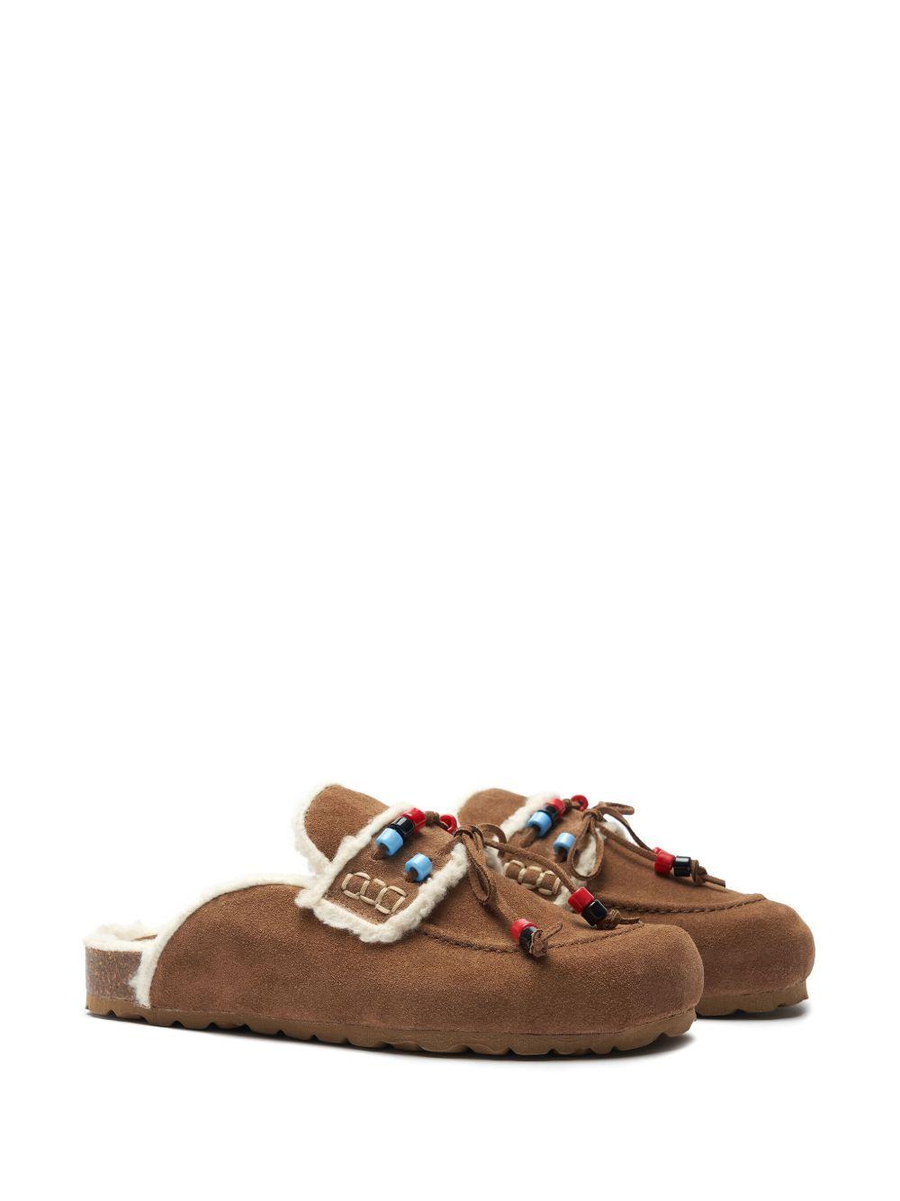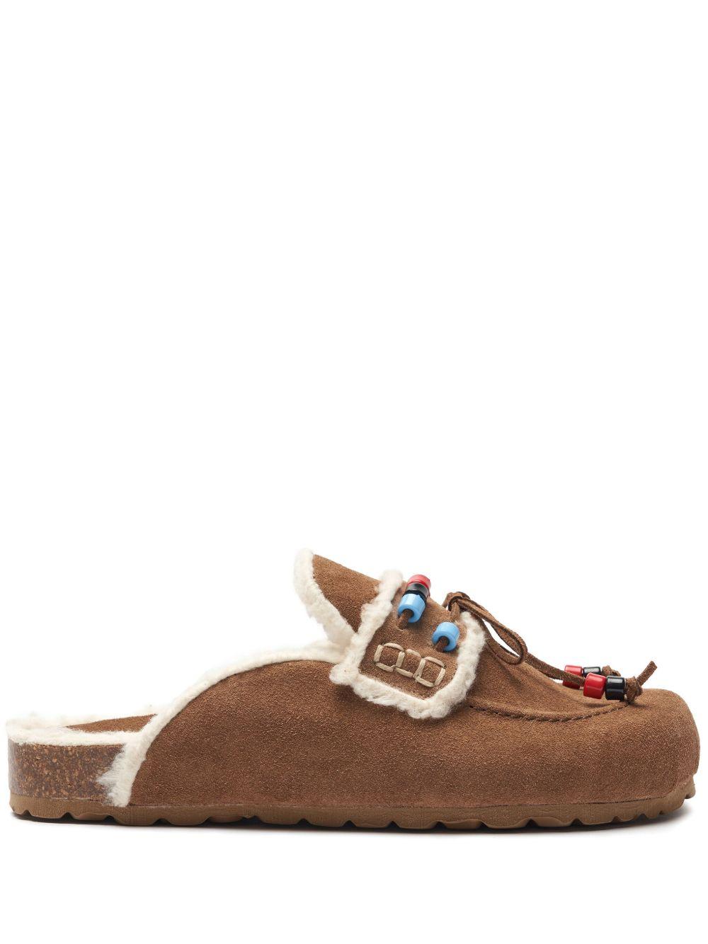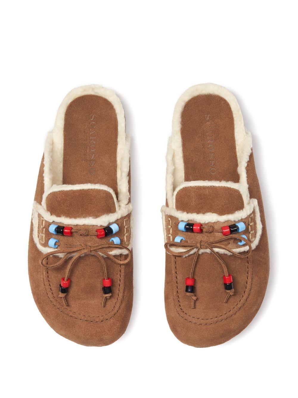 Scarosso Gita mules | Brown | camel brown | calf suede|/cotton | bead detailing | bow detailing | slip-on style | round toe | branded footbed | flat rubber sole | Suede | Flat Mules | Mules | Shoes | Women