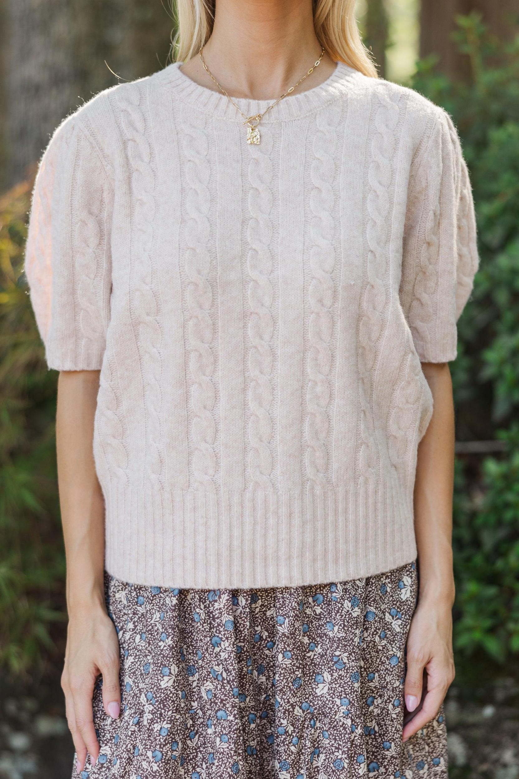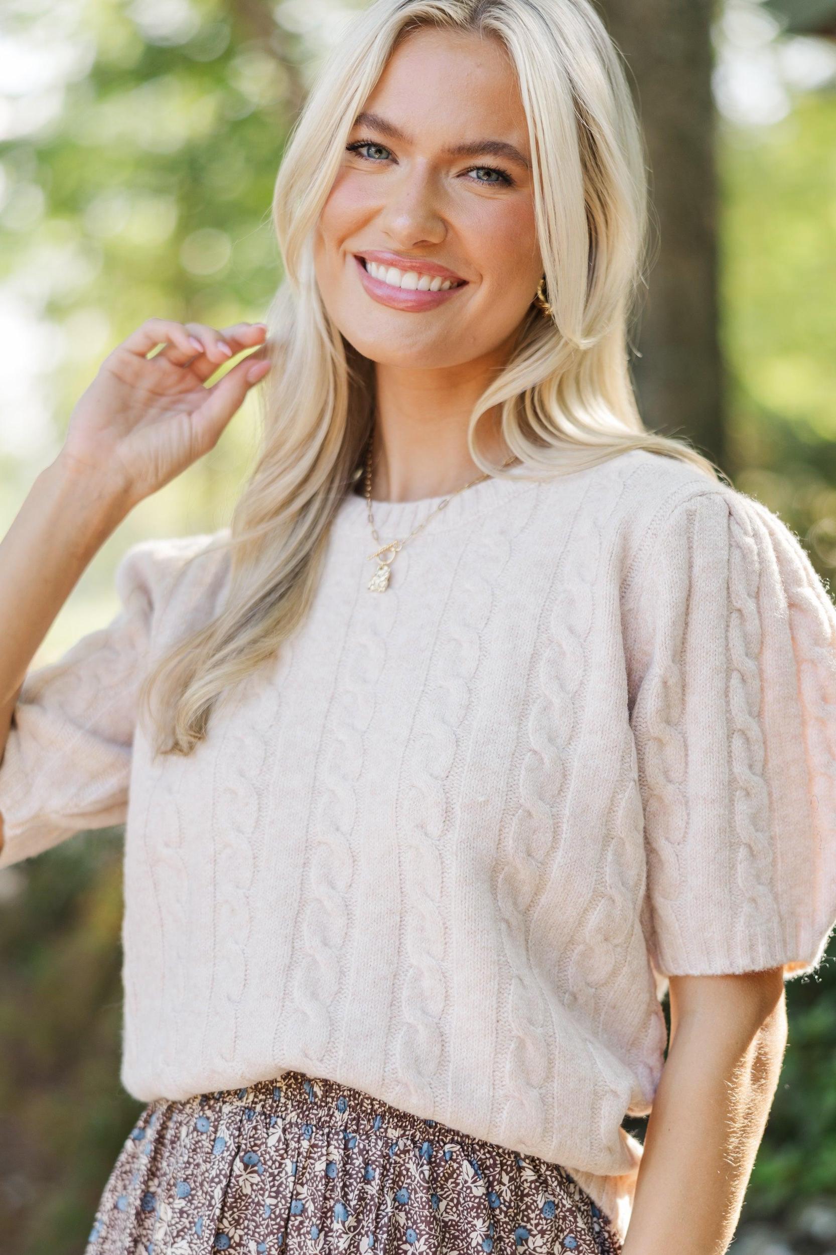 This short sleeve sweater is just so cute and versatile! That cable knit fabric is so cozy and we love the neutral hue! This sweater is going to style beautifully with skirts, jeans, layered over dresses, or with trousers! Round neckline Button keyhole back Short puff sleeves Cable knit fabric Fair stretch Baileigh is wearing the small.