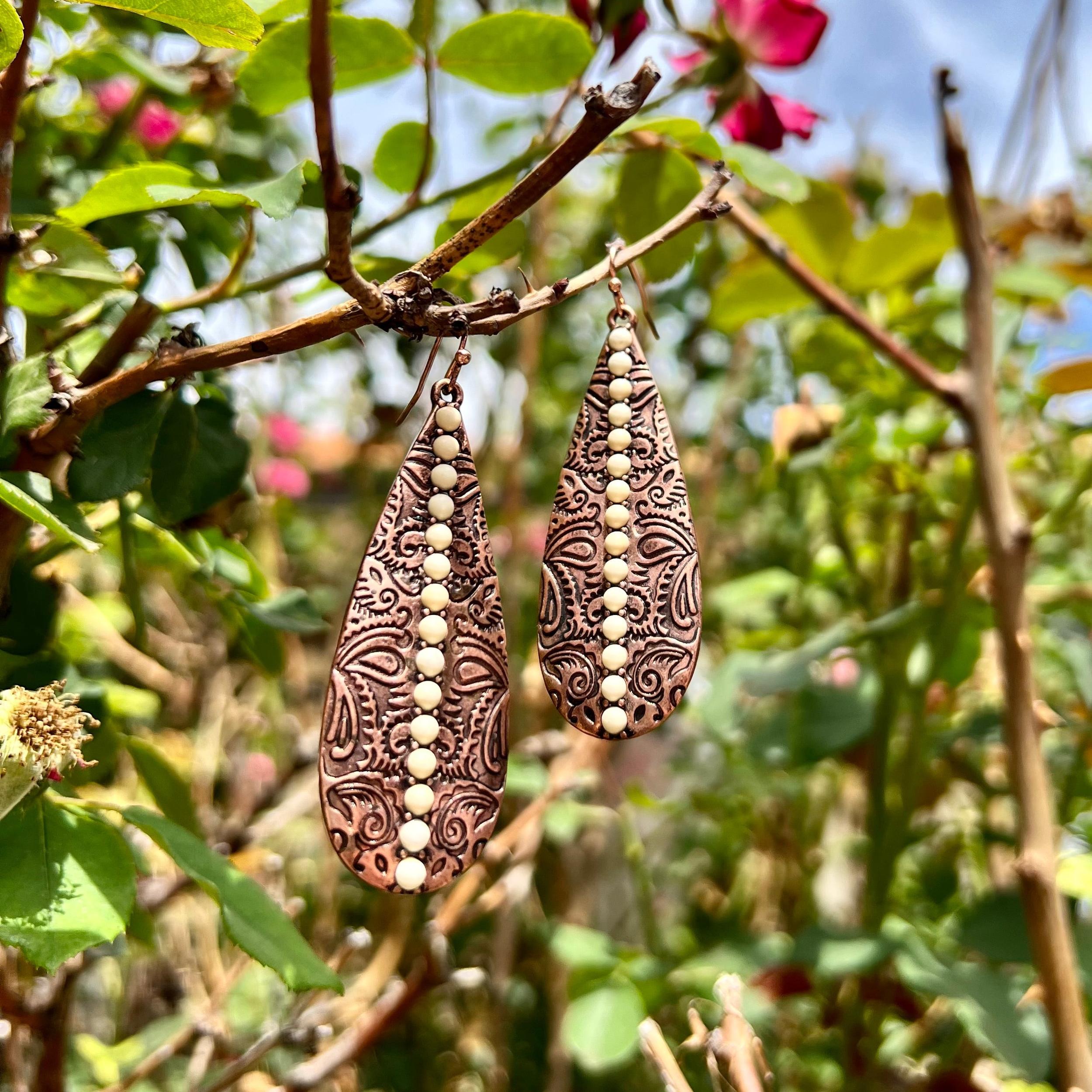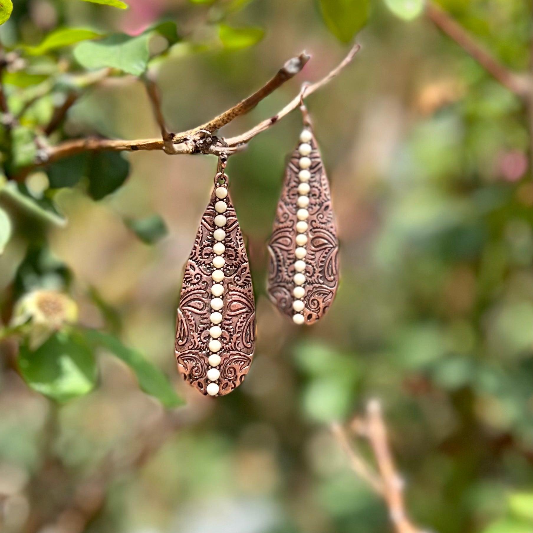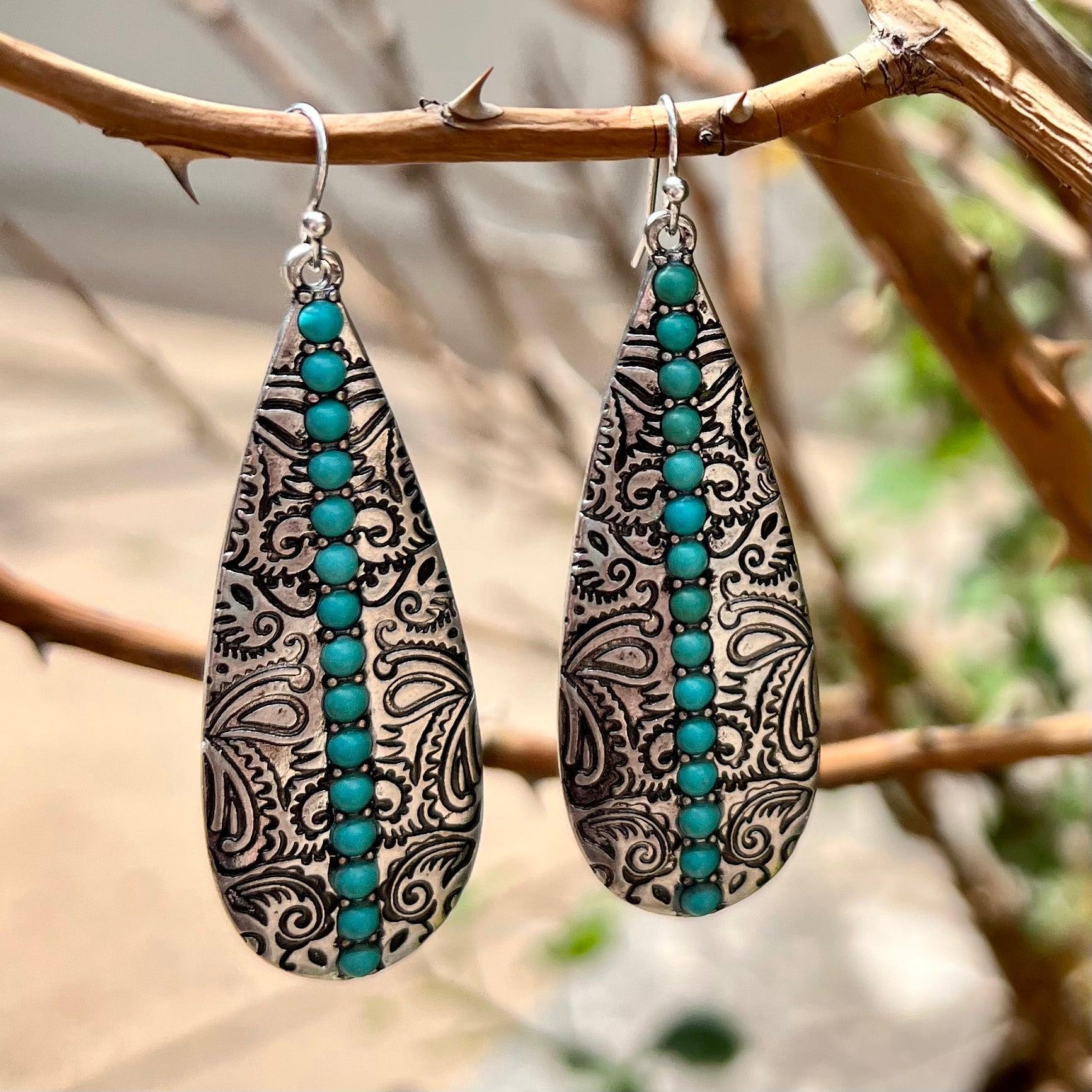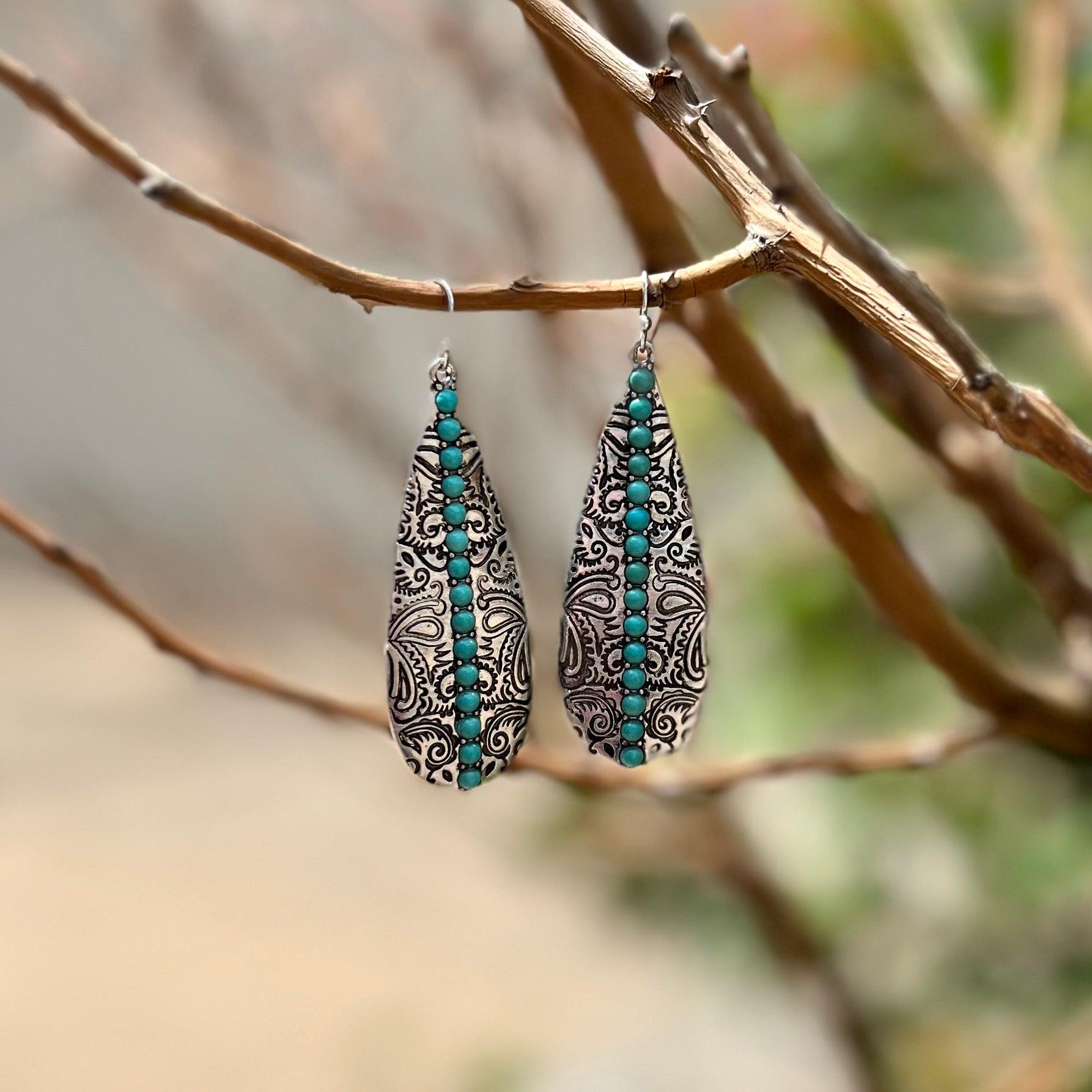 Beautifully crafted for a timeless look, the Give It To Me Straight Earrings are the perfect pick for a night out. Available in two color choices - silver and turquoise or copper and ivory - these earrings feature elegant paisley stamping and gently dangle 2.5" for a sophisticated, refined statement.