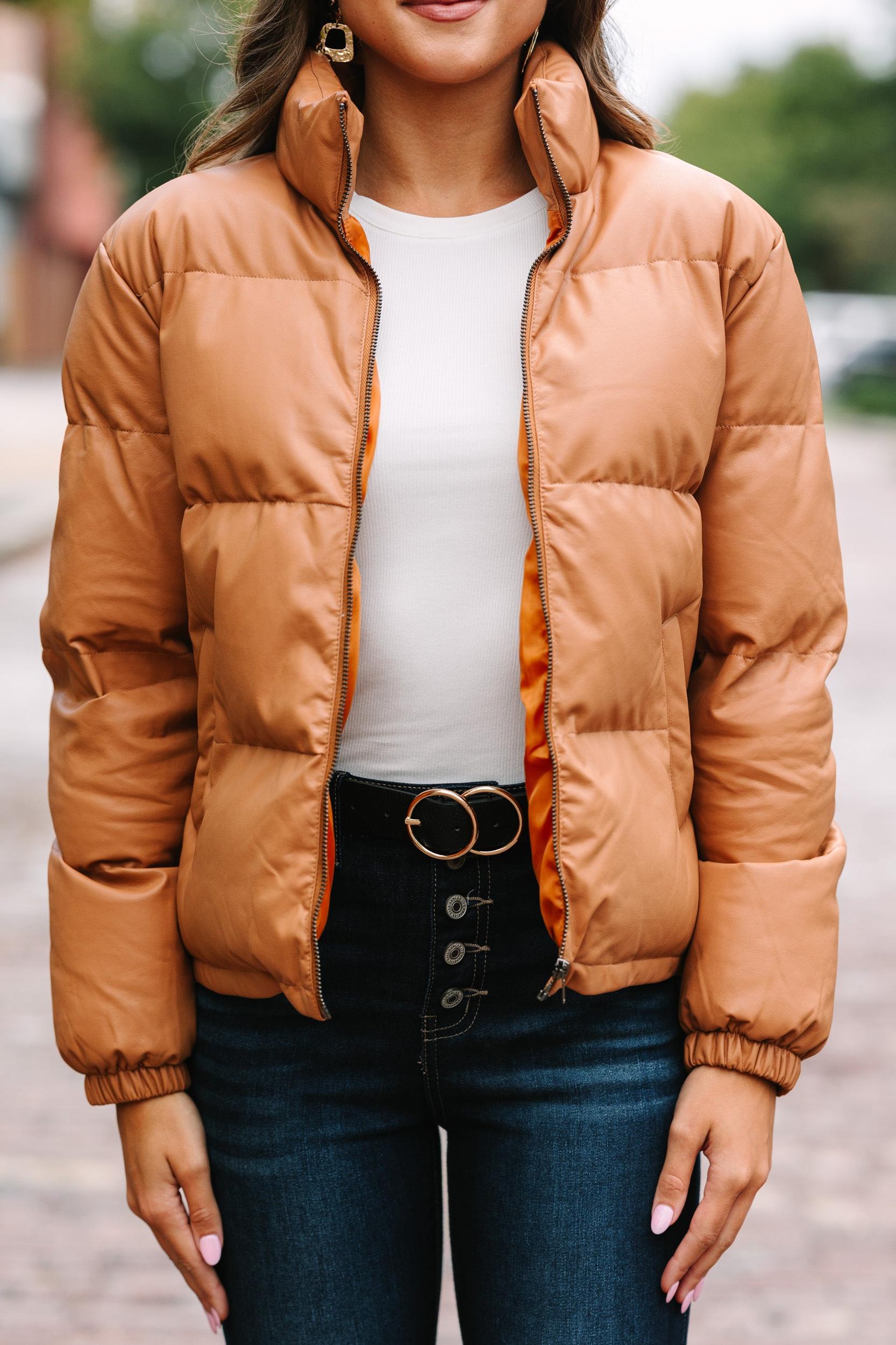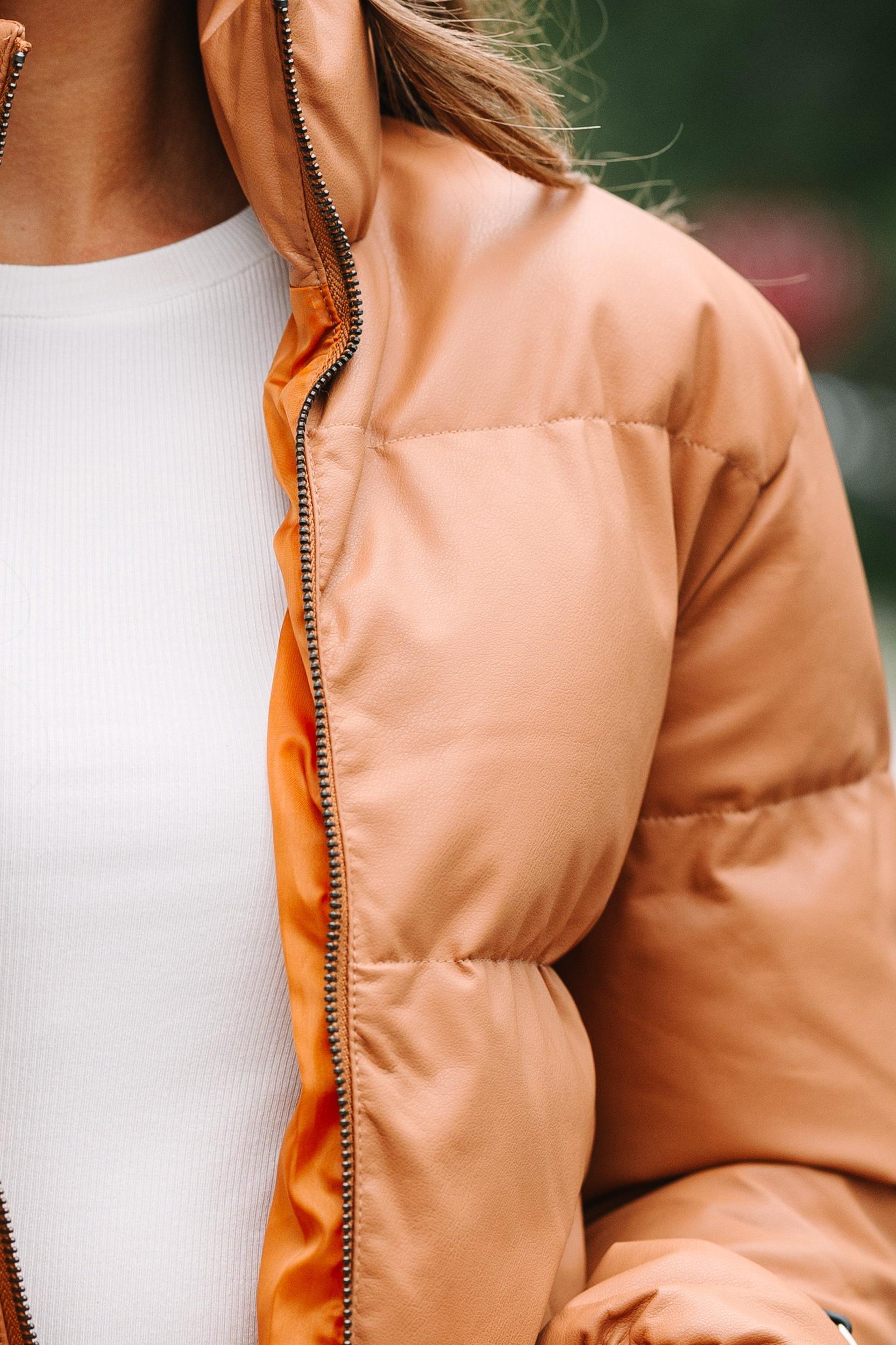 We are absolutely loving this puffer jacket! That neutral hue is so chic and that puffer style is so warm and cozy! This is going to be your new favorite fall jacket for sure! Stand up collar Zip front closure Long sleeves Puffer style Faux leather fabric No stretch Sydney is wearing the small.