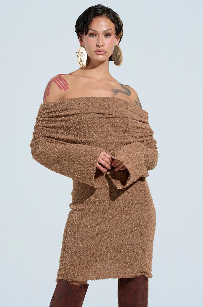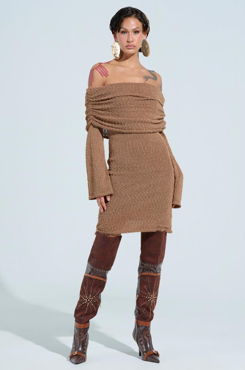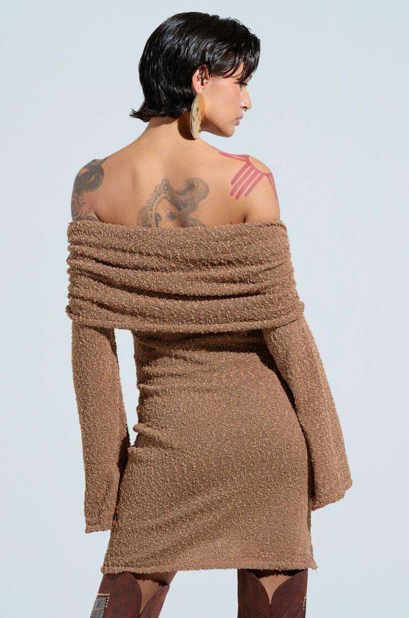 This might be fate… and your sign to buy The AKIRA Label Give Me A Reason Mini Dress. This cozy-sweet piece is crafted from a textured, double-lined knit base and features an elasticized off-the-shoulder fold over neckline, long flared sleeves, a subtly flared skirt, and a satiny inner lining. Complete with a skater dress silhouette, a mini length, and an easy, pull-on fit. Pair with knee-high leather stiletto boots, a red lip, and a shoulder bag for a finished look. - 100% Polyester- Hand Wash Cold- Stretchy- Imported (all measurements approximate from size small)- 35” Chest to Hem- 26” Sleeves- 17” Shoulder to Shoulder (stretchy)- Model is 5’7” and is wearing size small Product ID: 470499