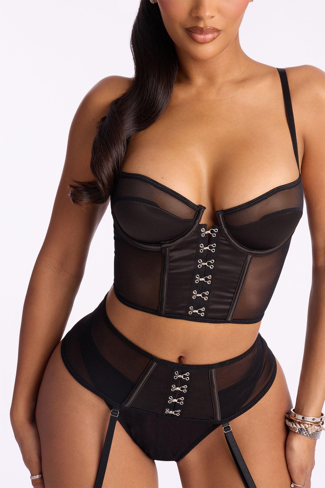 Available In Black. 3 PC Mesh Set Adjustable Straps Faux Leather Detail Undewire Hook And Eye Closure Matching Garter Belt Matching Thong Panty Final Sale Shell : 92% Polyester 8% Spandex Mesh : 88% Nylon 12% Spandex Imported California Proposition 65WARNING: Cancer and Reproductive Harm - www.P65Warnings.ca.gov.