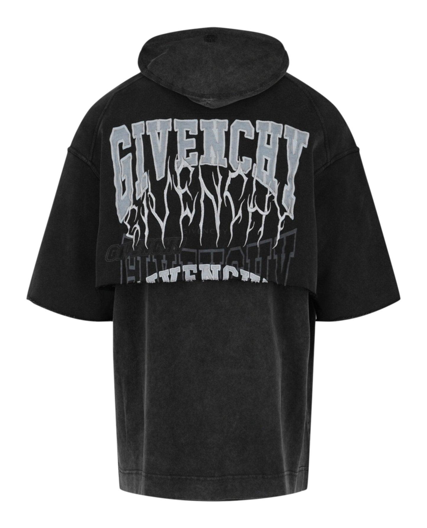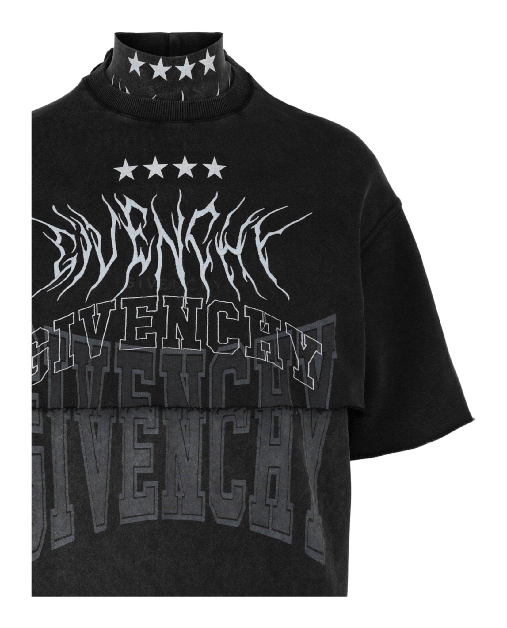 A layered look featuring a graphic-printed mock neck top with an integrated balaclava, worn under a cropped short-sleeve sweater with embroidered accents.