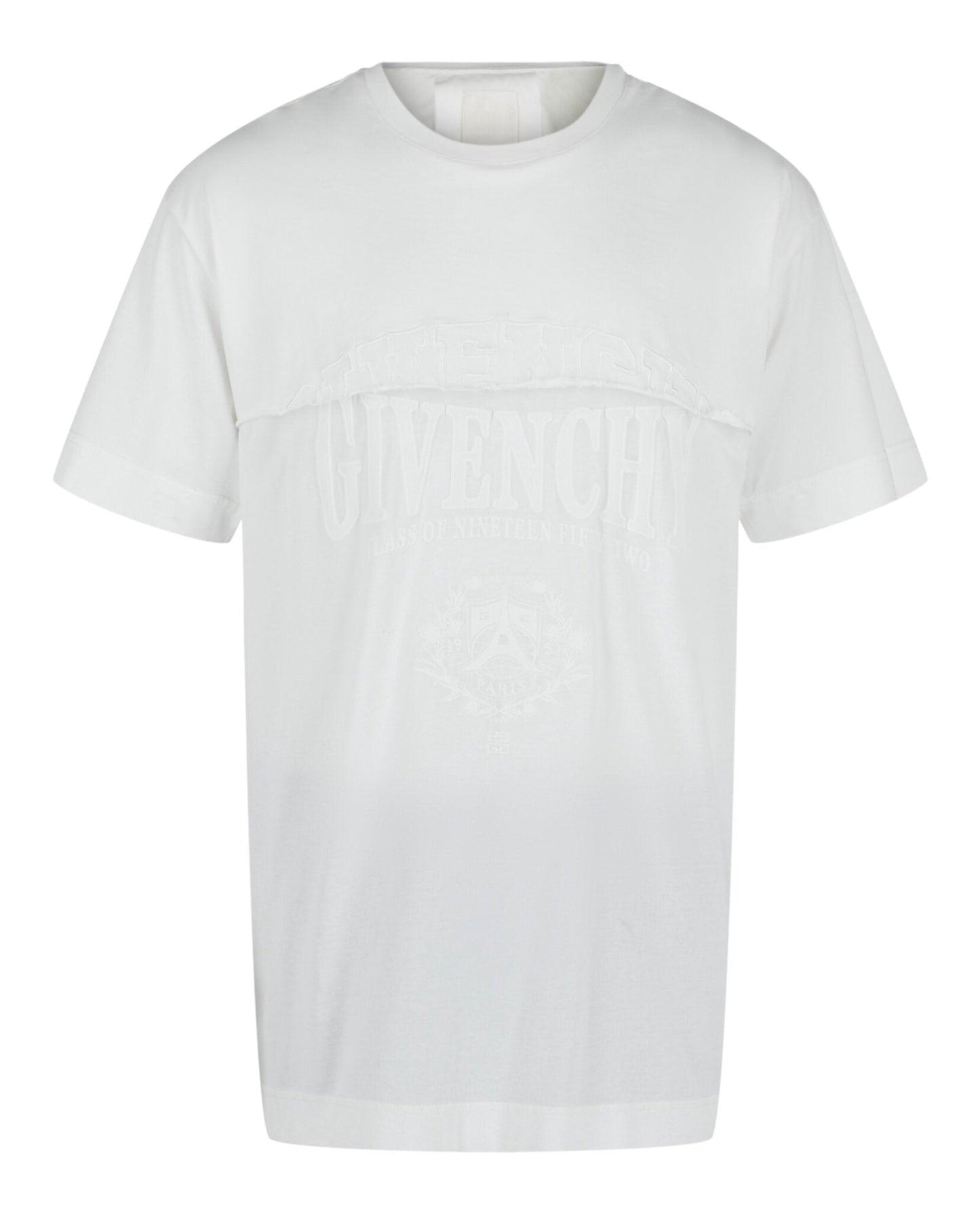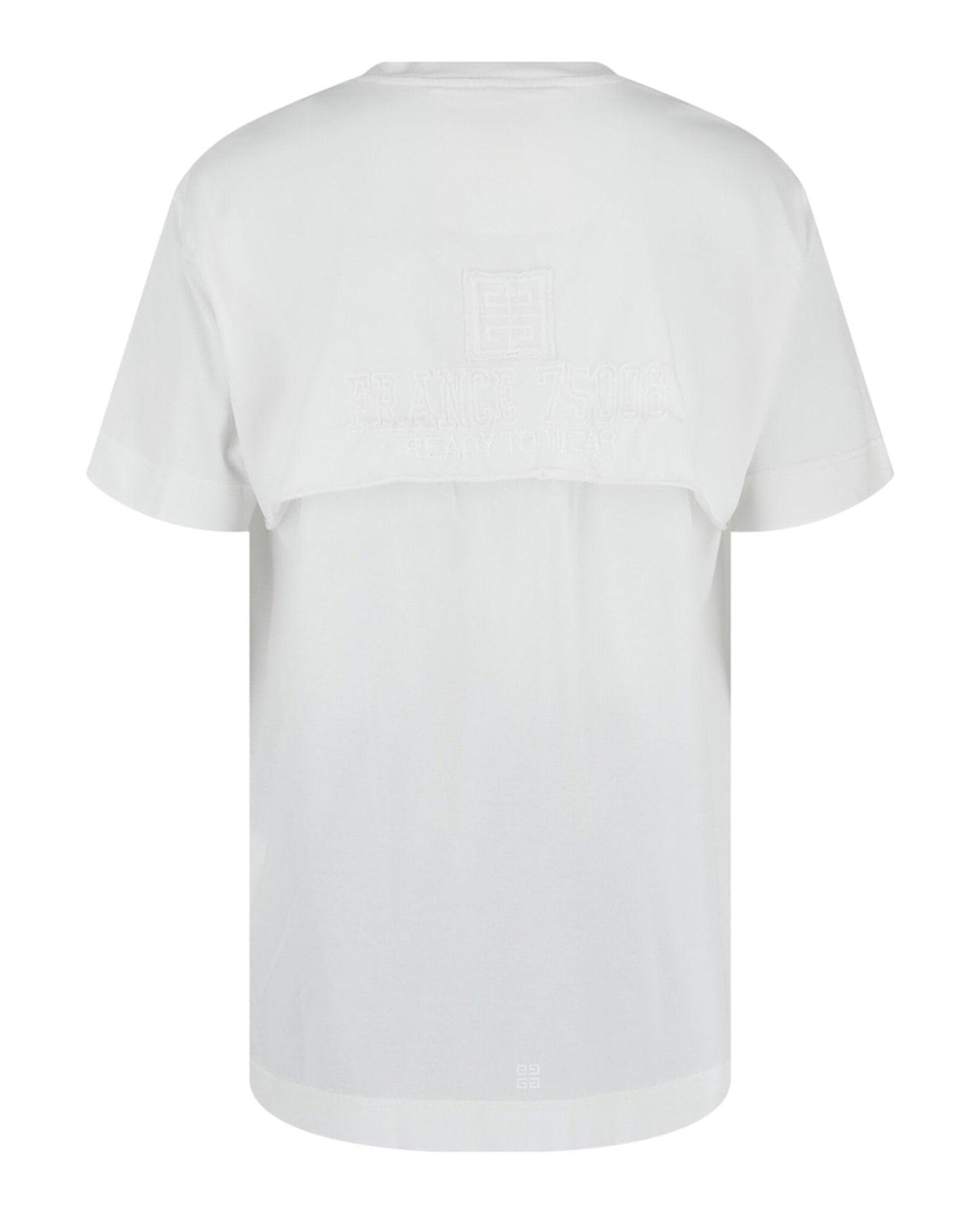 Faux layered look featuring a graphic-printed and embroidered under layer with a cropped partial layer with embroidered detail at the front and back.