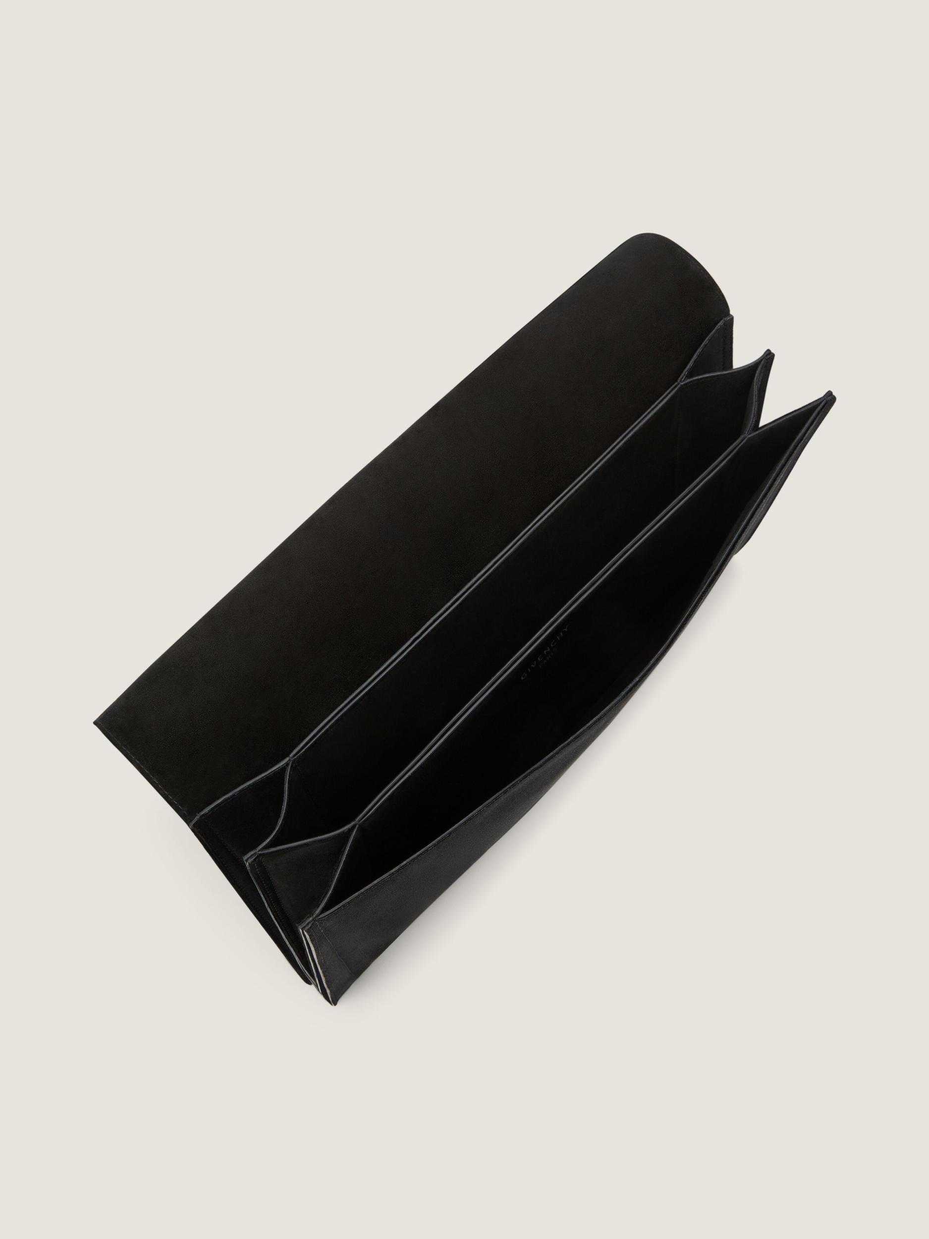 Pochette in satin. Flap opening. Triple gussets construction. GIVENCHY Paris 1952 signature embroidered on the front. GIVENCHY Paris signature on the inside. Raw finishes with pulled threads and irregular stitching evoking rediscovered kraft envelopes that held the patterns from Hubert de Givenchy’s first collection. Three compartments. Suede lining.