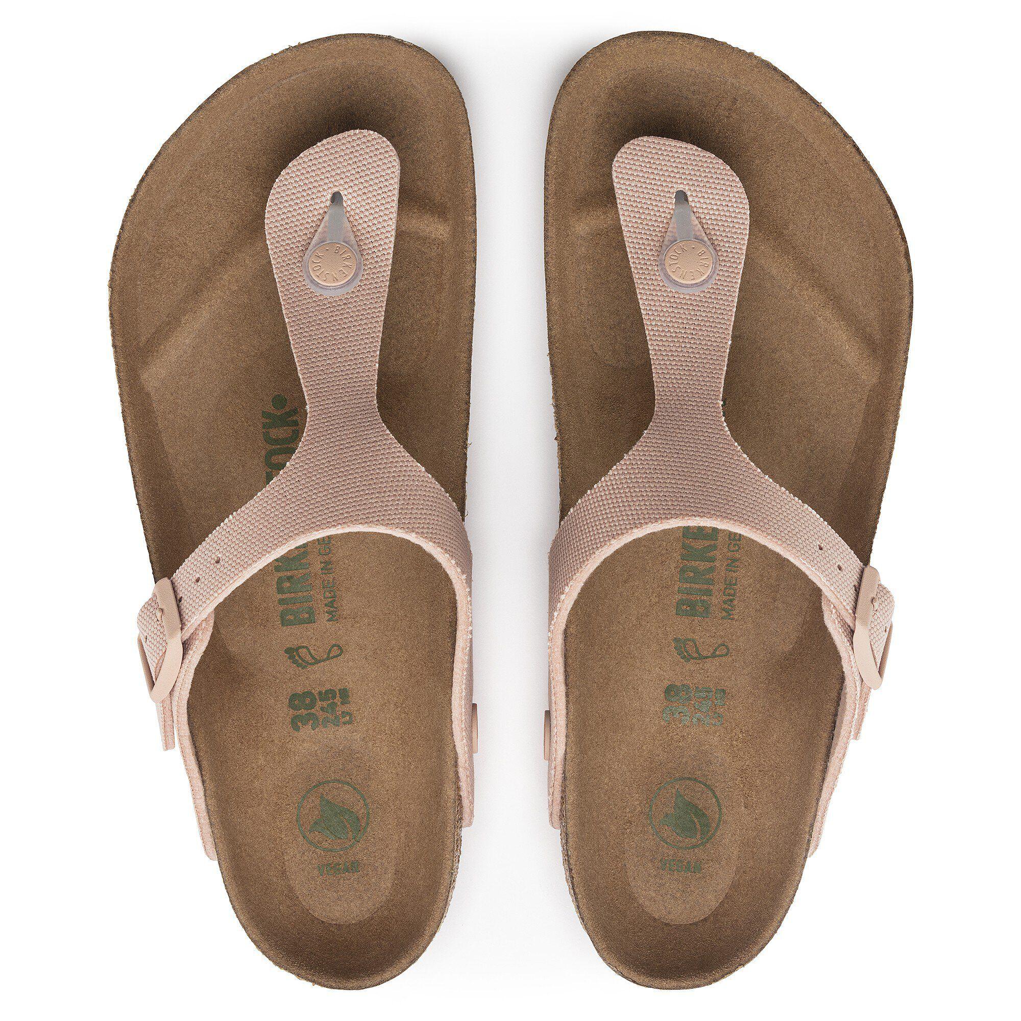 The Gizeh brings legendary comfort and elegant detailing to the thong sandal. This season the design goes vegan with a 100% natural cotton canvas upper, giving you a lighter look for warmer months. Tonal details, from buckle to sole, bring it all together. The style stays grounded in an original BIRKENSTOCK footbed, designed to shape to you for custom support. Contoured cork-latex footbed creates custom support with wear Vegan 100% natural cotton canvas upper Microfiber footbed lining EVA sole is flexible and lightweight Thong style with embossed metal pin buckle Made in Germany