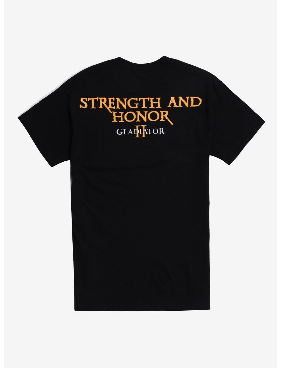 Step into the arena with this Gladiator II tee! Featuring a striking portrait of the fearless warrior, Lucius, on the front and "Strength and Honor" verbiage on the back.100% cottonWash cold; dry lowImportedListed in men's/unisex sizes