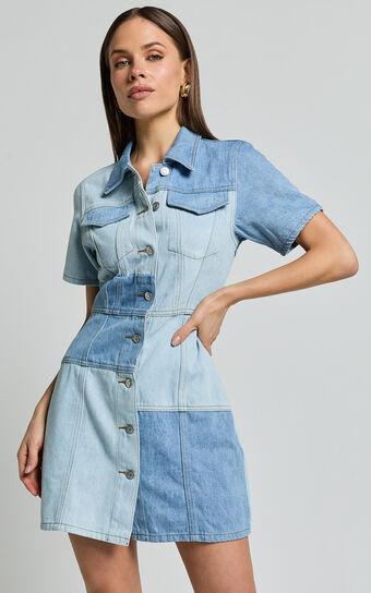 Elevate your style with our Gladys Mini Dress, a mesmerizing short sleeve patchwork denim dress that's an absolute game-changer for your wardrobe. Crafted with the finest cotton for that unbeatable comfort and featuring an assortment of denim shades in a playful patchwork design, this dress shouts individuality and style. Ideal for the fashion-forward Gen Z and Millennials, the Gladys Mini Dress is a standout piece in our Dresses collection, effortlessly blending casual chic with a touch of elegance.Product Details:Buttons front closureShirt Dress styleDenim fabricCollar necklineCasual wearMini lengthShort SleeveCotton materialSize and FitSize S / 8 length: 85cm / 33.46inMaterial and Care99% Cotton, 1% SpandexLow Stretch