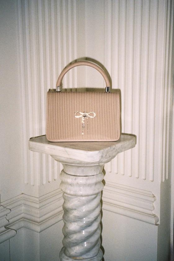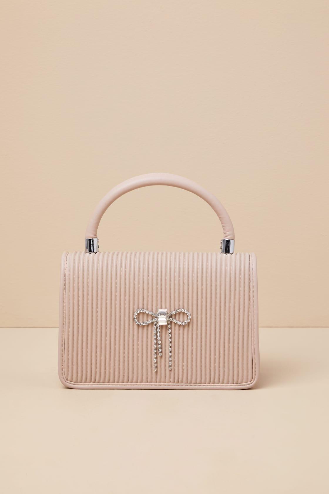 The Glam Impression Beige Rhinestone Bow Handbag is here to make your OOTD a little more memorable! This vegan leather handbag has a flat bottom design, a structured top handle, and a ribbed-like texture across the front flap, along with a sparkling rhinestone bow at the center. Undo the magnetic closure to reveal a lined interior with a sidewall zipper pocket, perfect for storing all your must-haves. A removable and adjustable crossbody strap allows for versatile styling! Silver hardware.