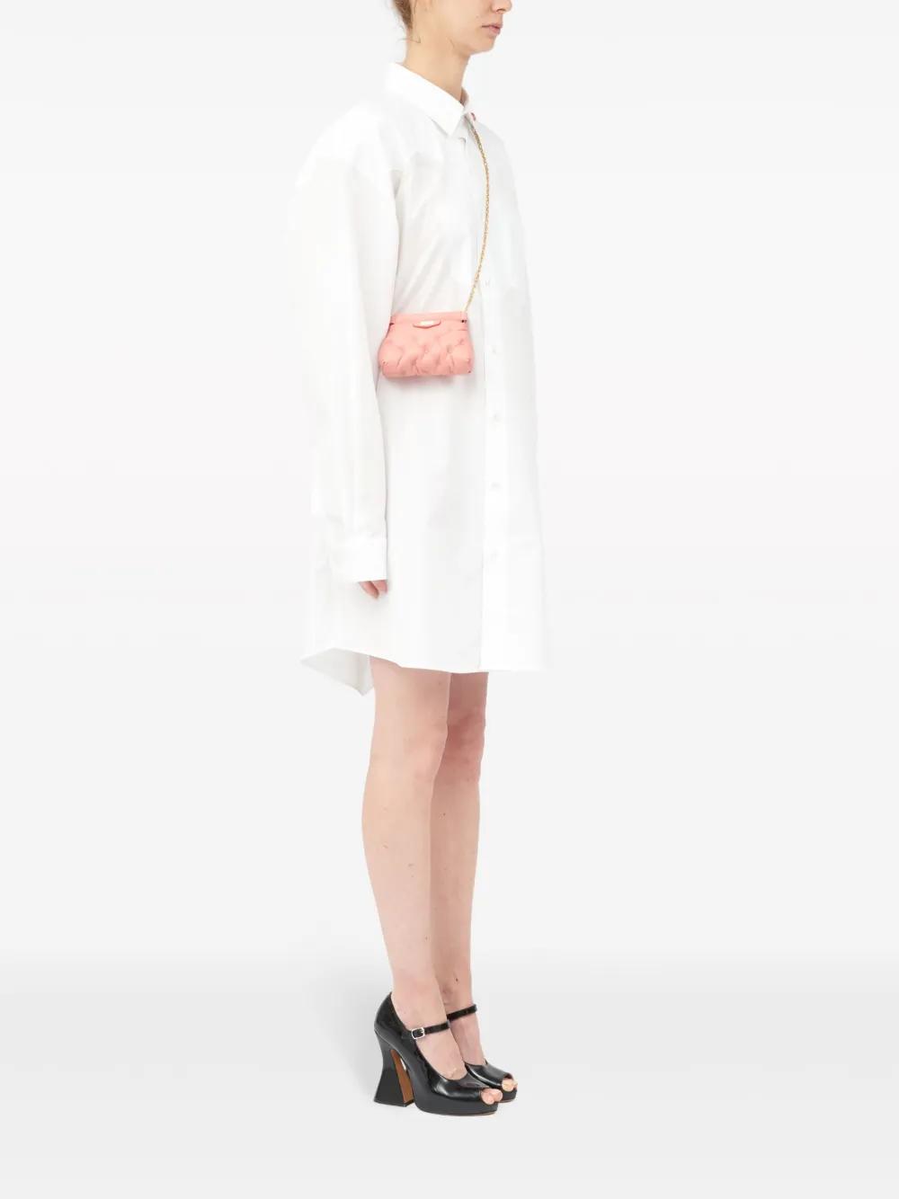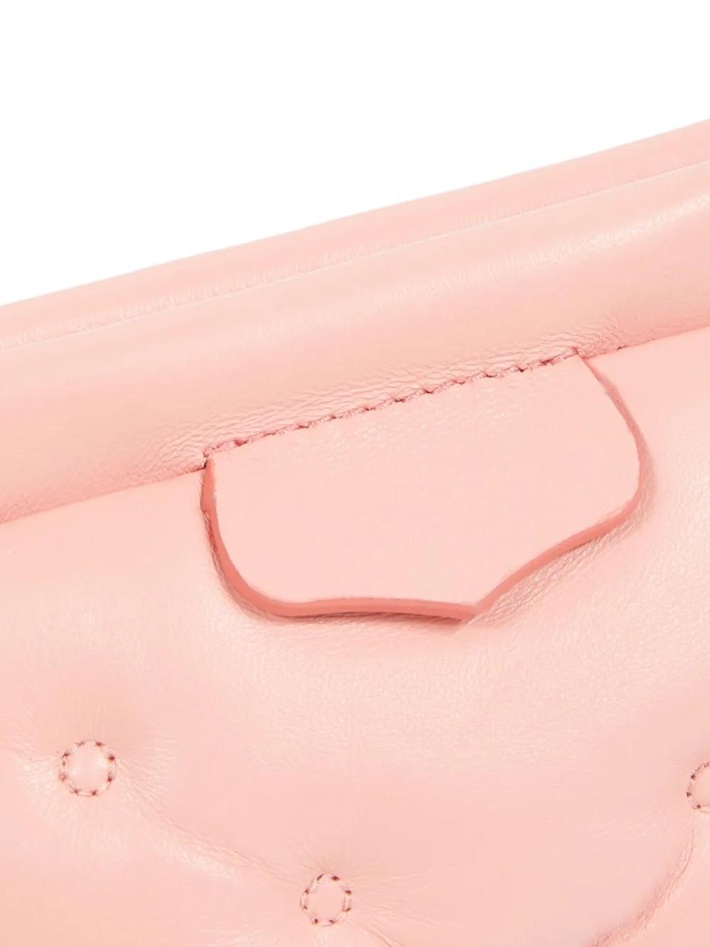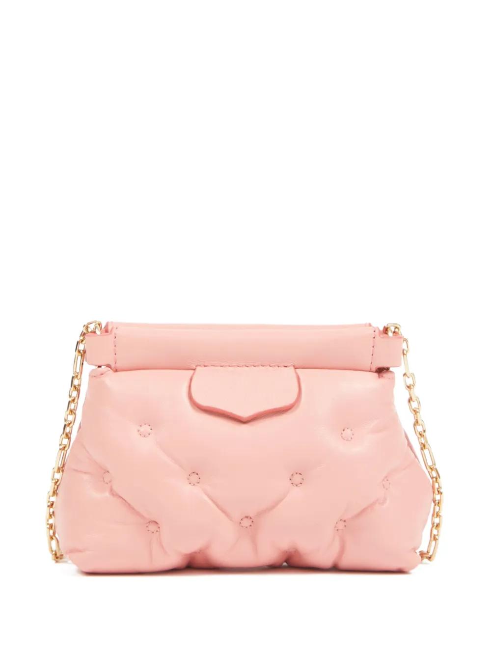 Maison Margiela's iconic Glam Slam Classique bag is showcased here in a micro size. First unveiled on the SS18 runway, it is characterised by its quilted silhouette, drawing inspiration from hand-stitched quilts created in Marseilles. This iteration is presented in coral pink and features a detachable chain-link strap.