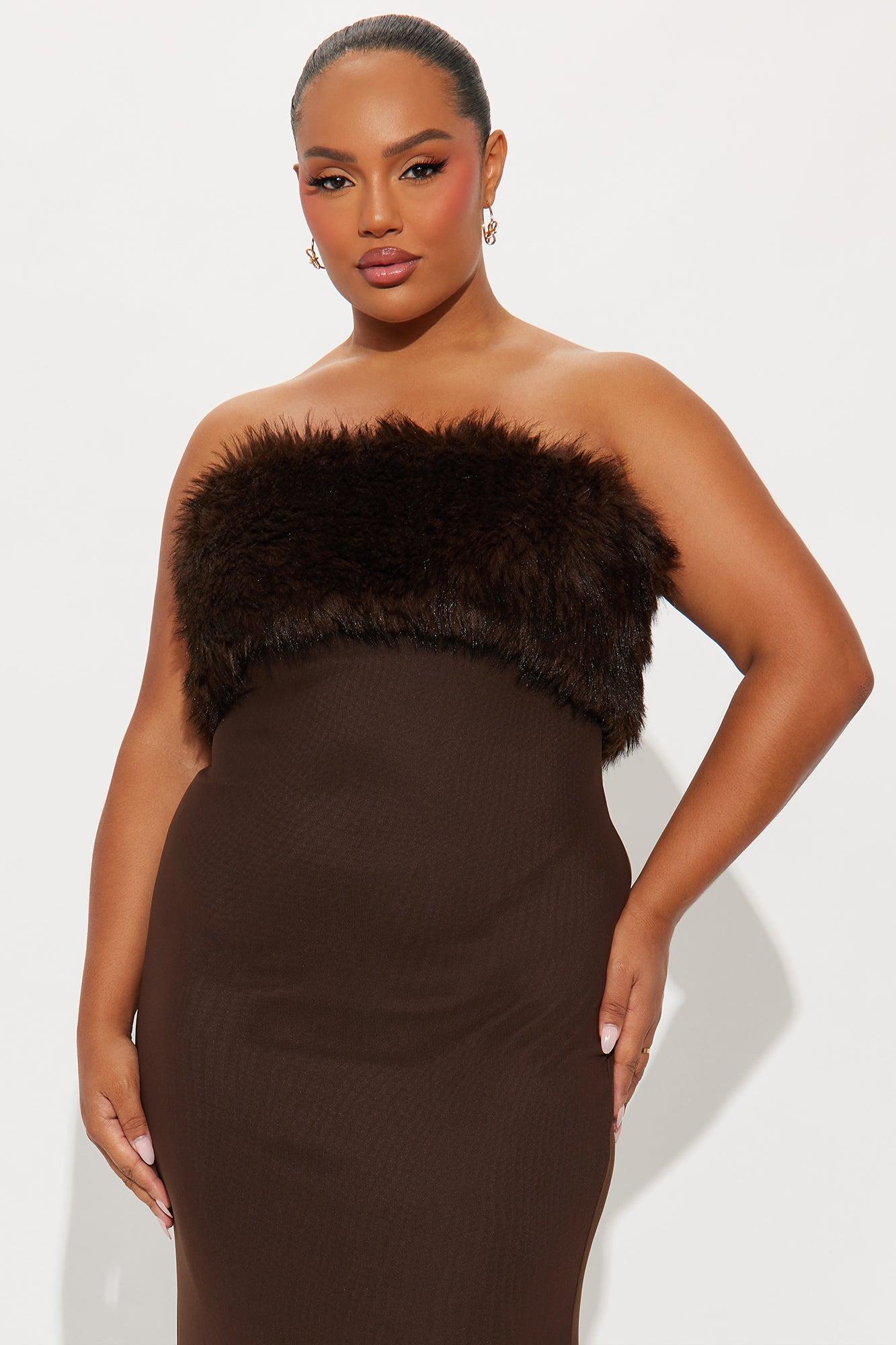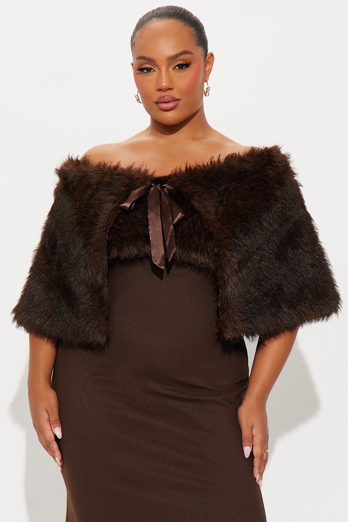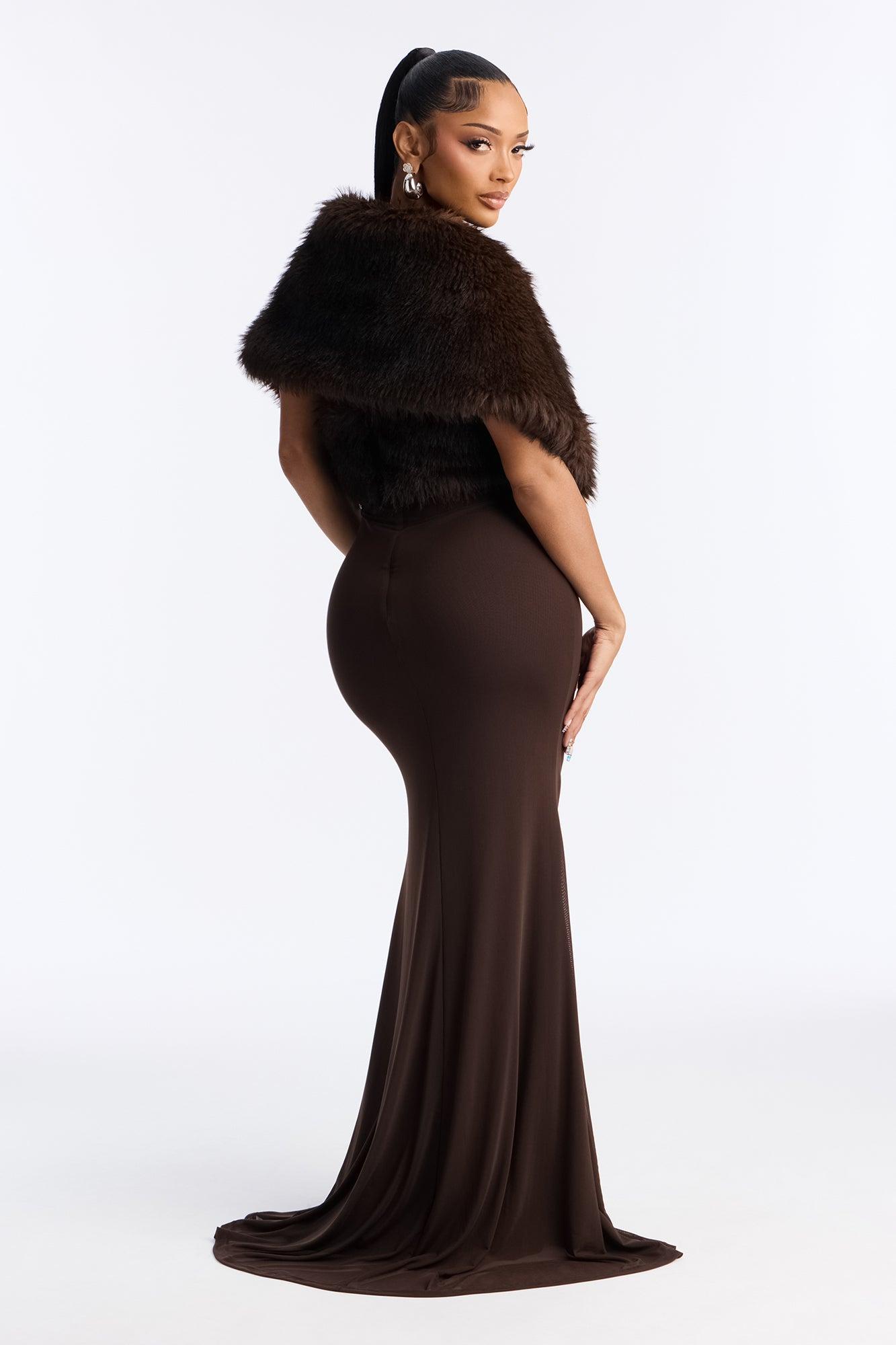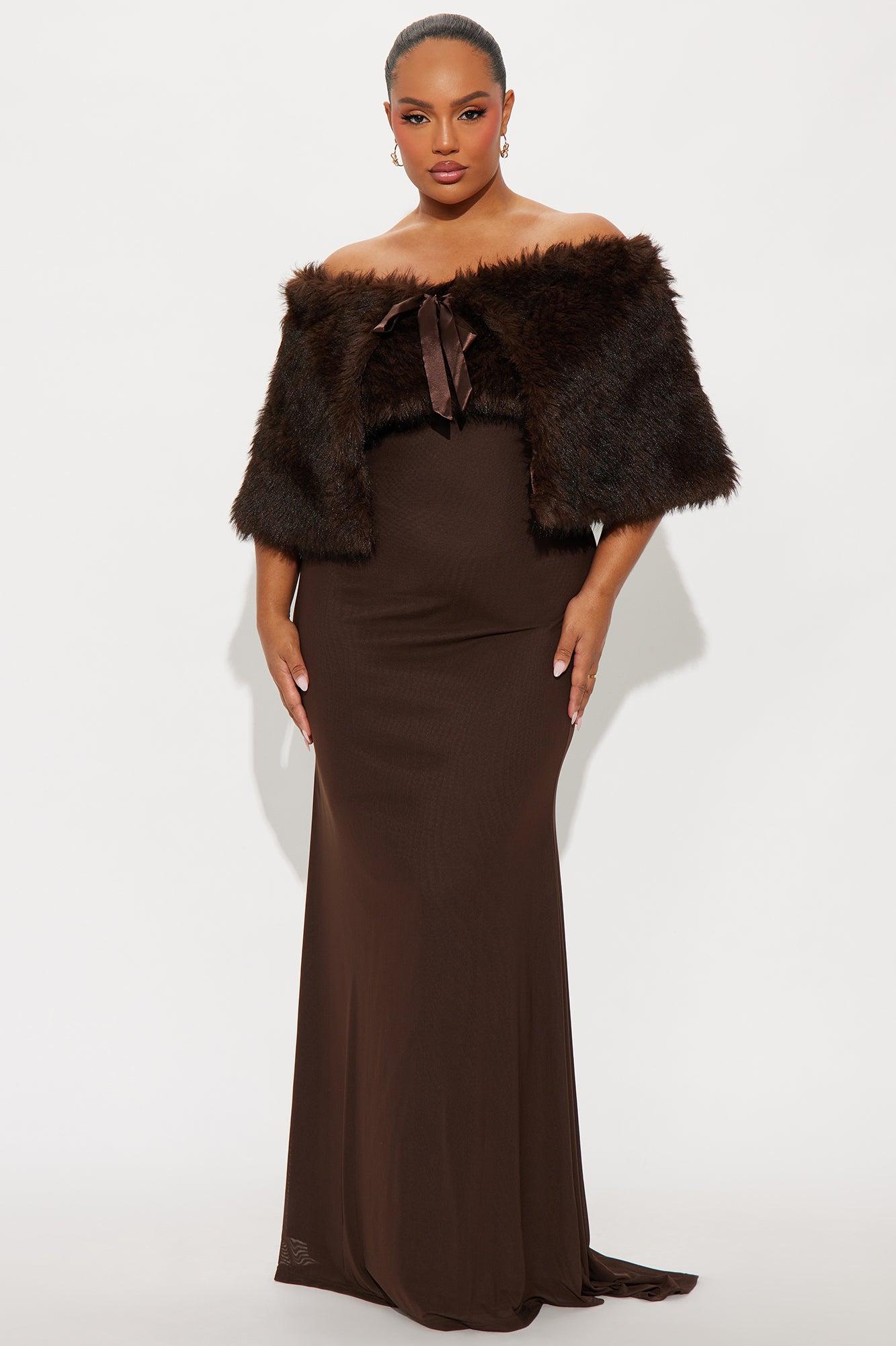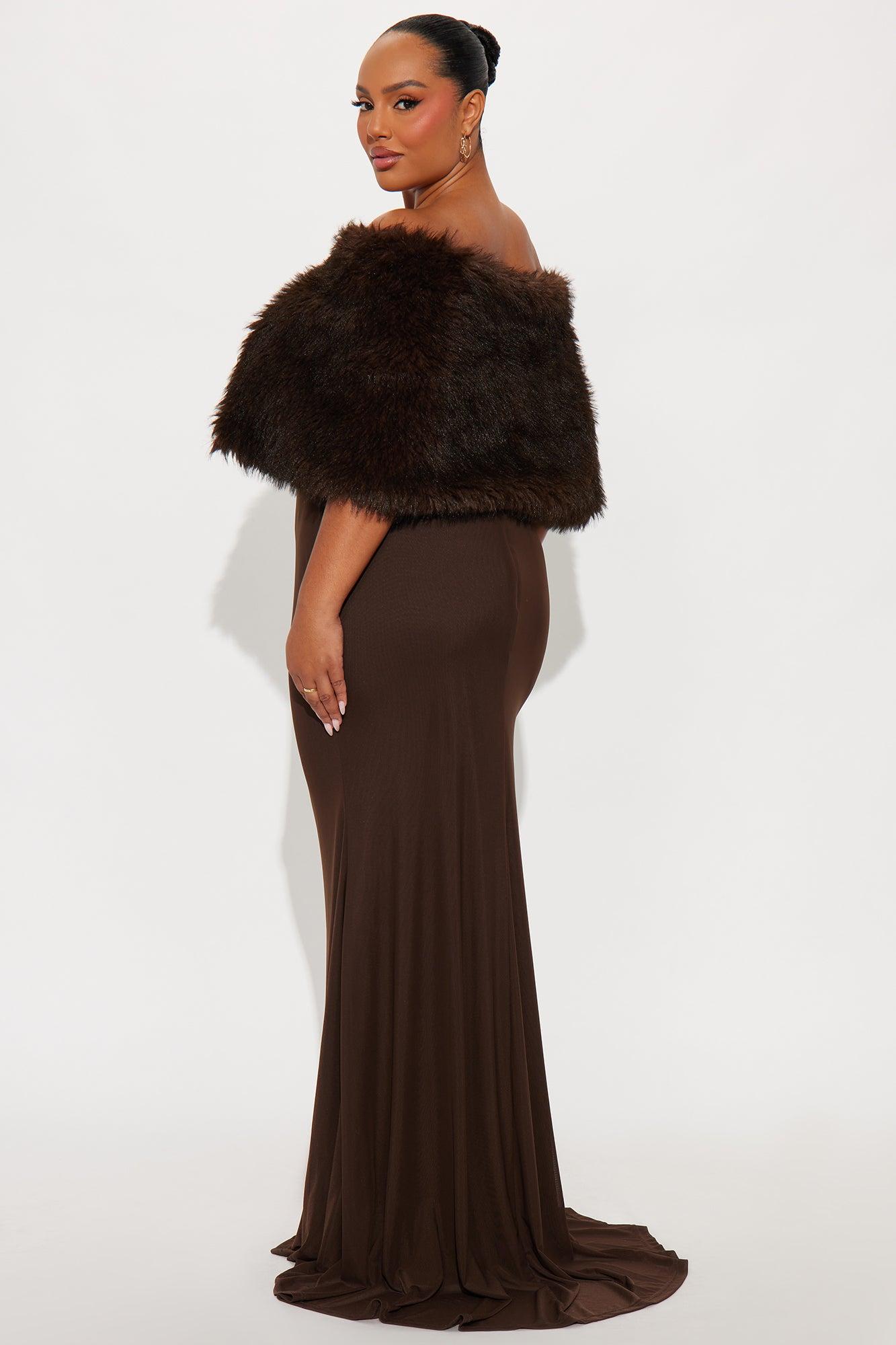 Available In Burgundy And Chocolate. 2 Piece Gown Set Faux Fur Shall Button Closure Mesh Gown Strapless Straight Neckline Faux Fur Trim Hidden Back Zipper Lined/Stretch Self : 95% Polyester 5% Spandex Lining 1 : 97% Polyester 3% Spandex Lining 2 : 100% Polyester Faux Fur : 100% Polyester Imported