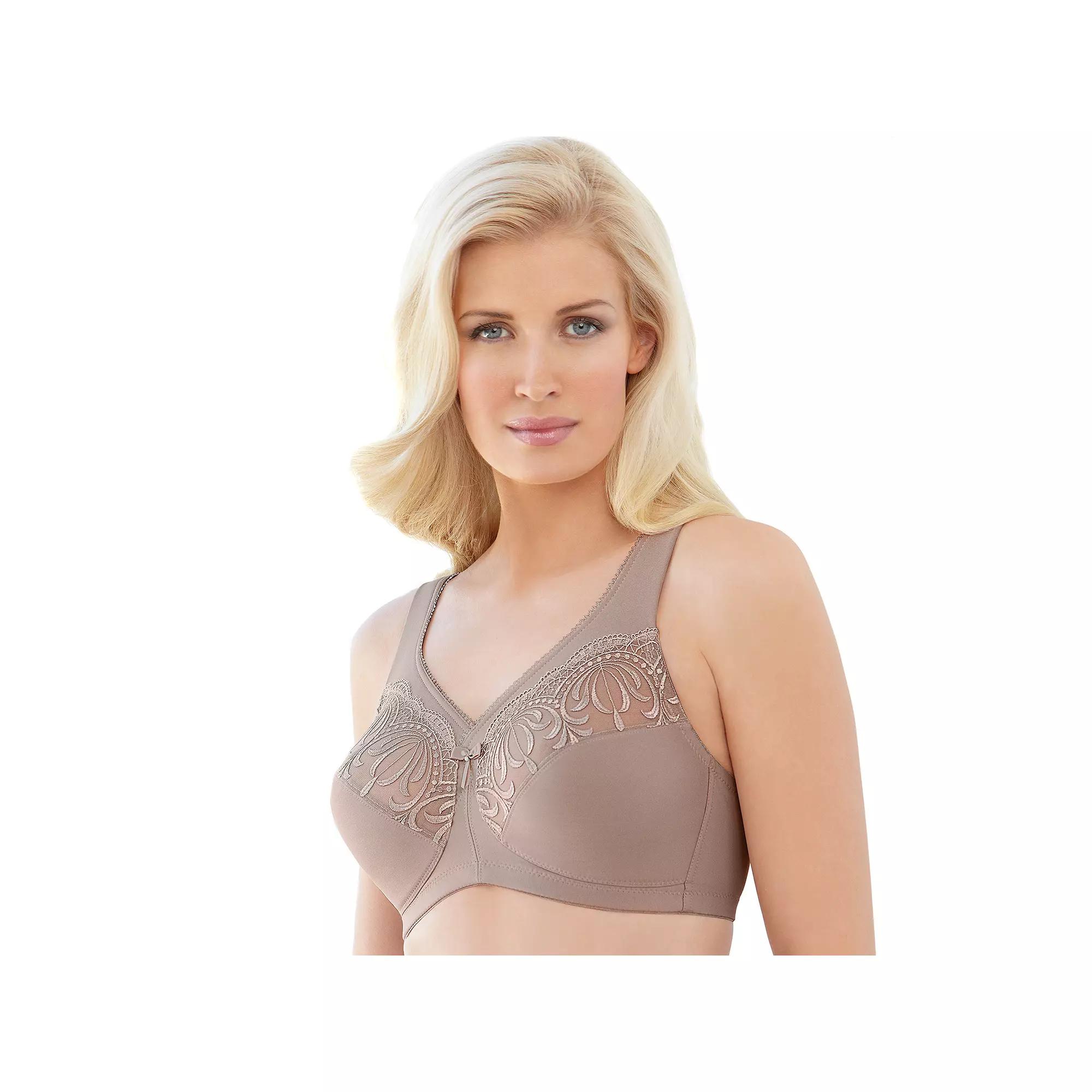 Embroidery and micro-denier fabric combine for a luxurious look and feel in this women's Glamorise MagicLift bra. Full coverage Wide adjustable shoulder straps Wire free Back hook & eye closure Style no. 1016 FIT & SIZING 3 hooks: 34-40 B, C, D, DD, F, G, H, I 4 hooks: 42-50 B; 42 -56 C, D, DD, F, G, H, I FABRIC & CARE Nylon, polyester, spandex Machine wash Imported Size: 54 I. Color: Med Beige. Gender: female. Age Group: adult. Pattern: embroidered.