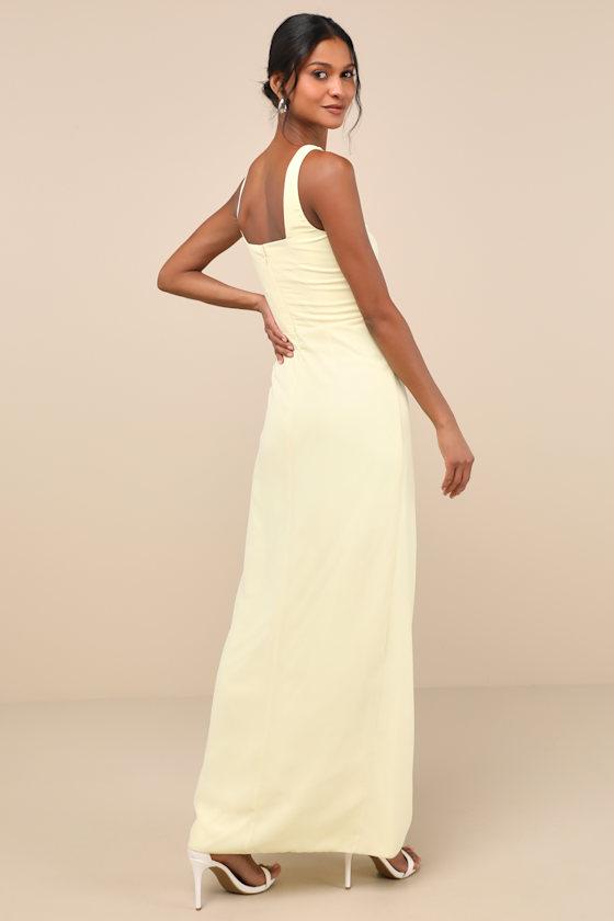 If you always reach for the most elegant option, you need the Lulus Glamorous Disposition Light Yellow Ruched Maxi Dress! Lightweight woven chiffon shapes this sophisticated dress that has a seamed bodice with slender straps and a square neckline. High, fitted waist tops a chic skirt that has strategic side ruching and an overlapping design that creates a flirty front slit, ending at a maxi hem. Hidden zipper/clasp at back.