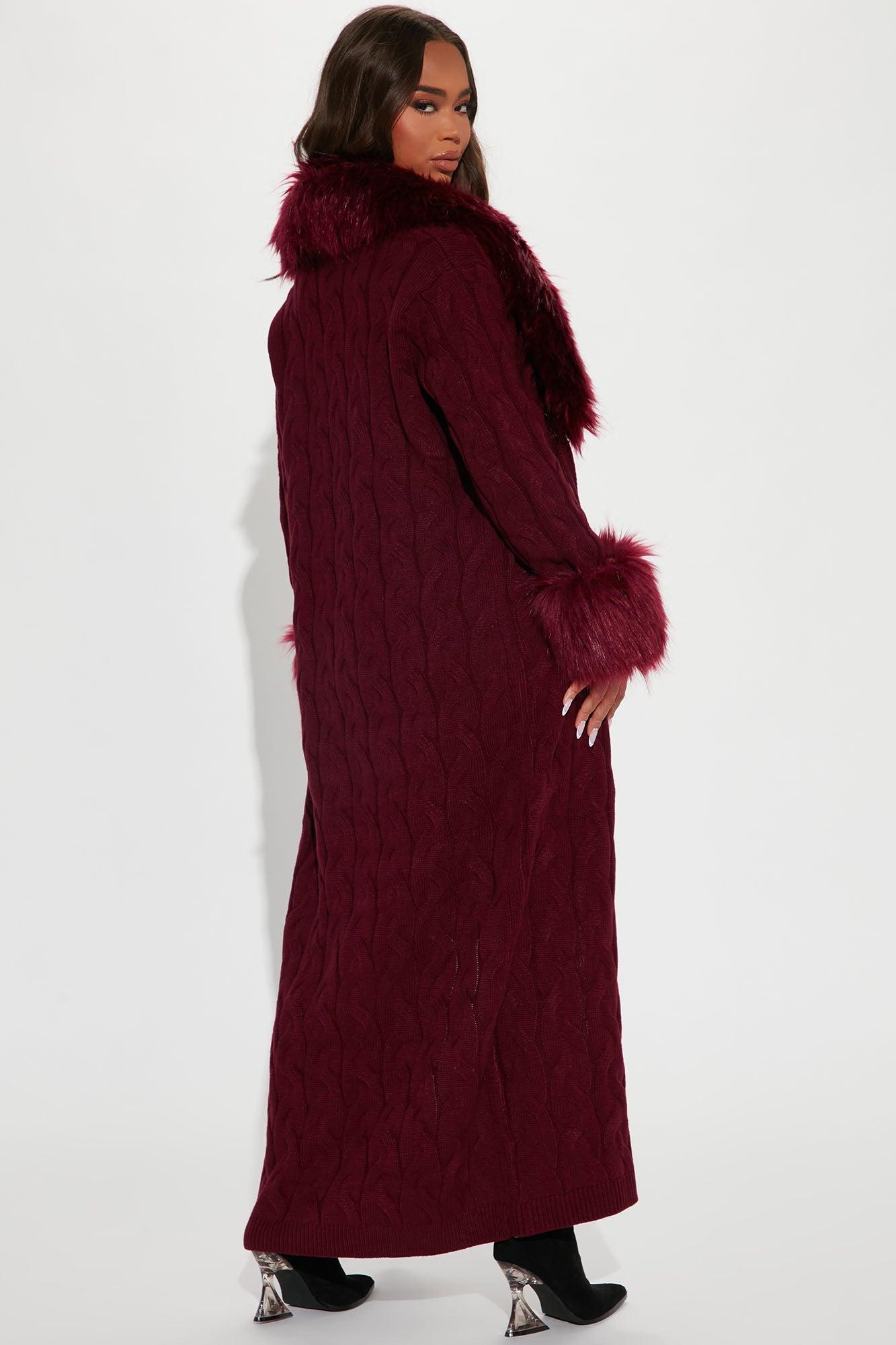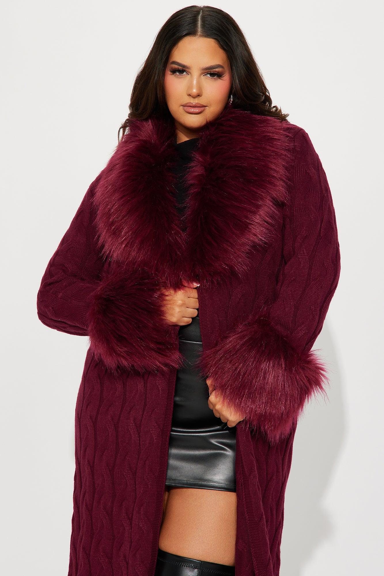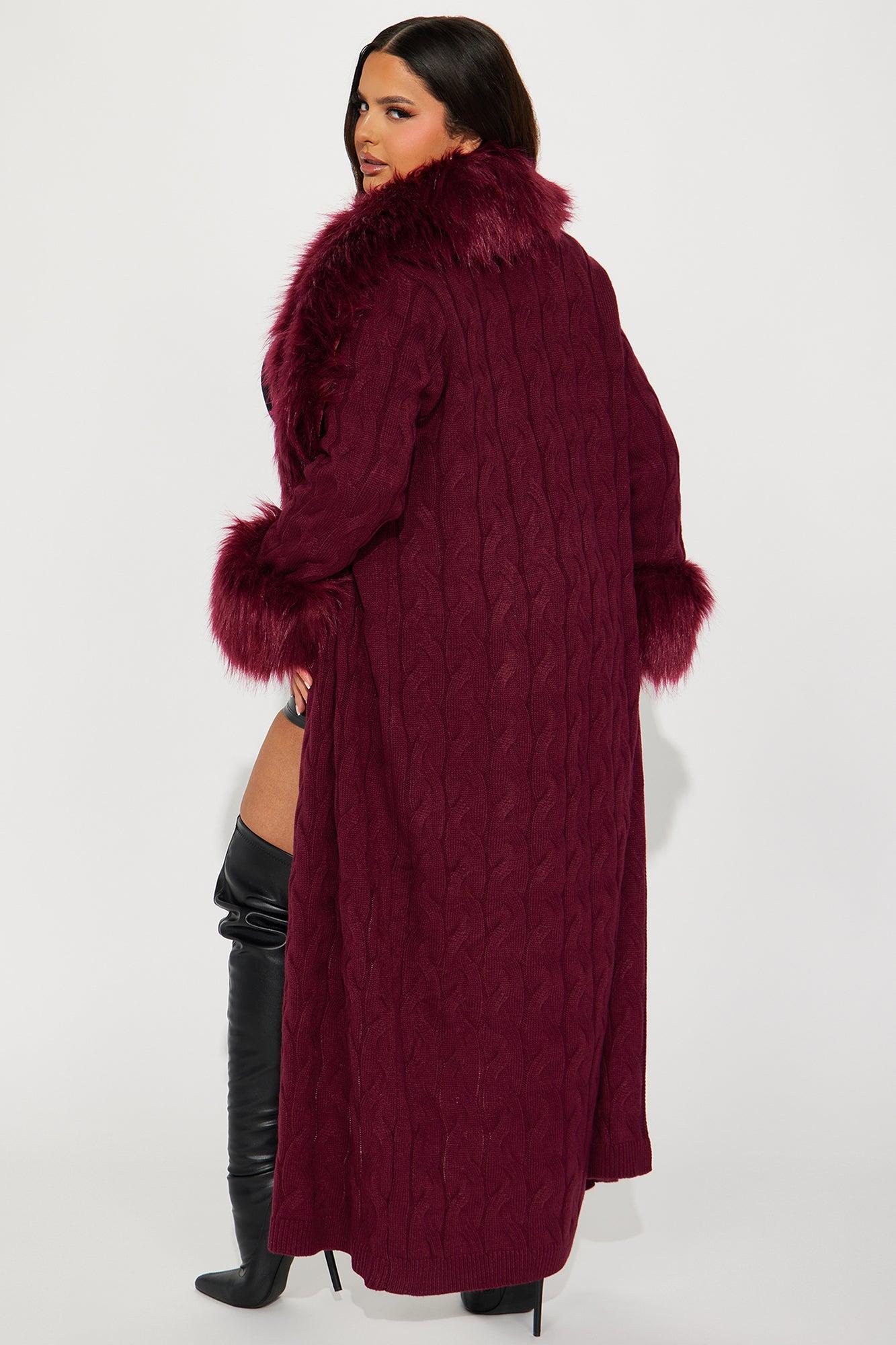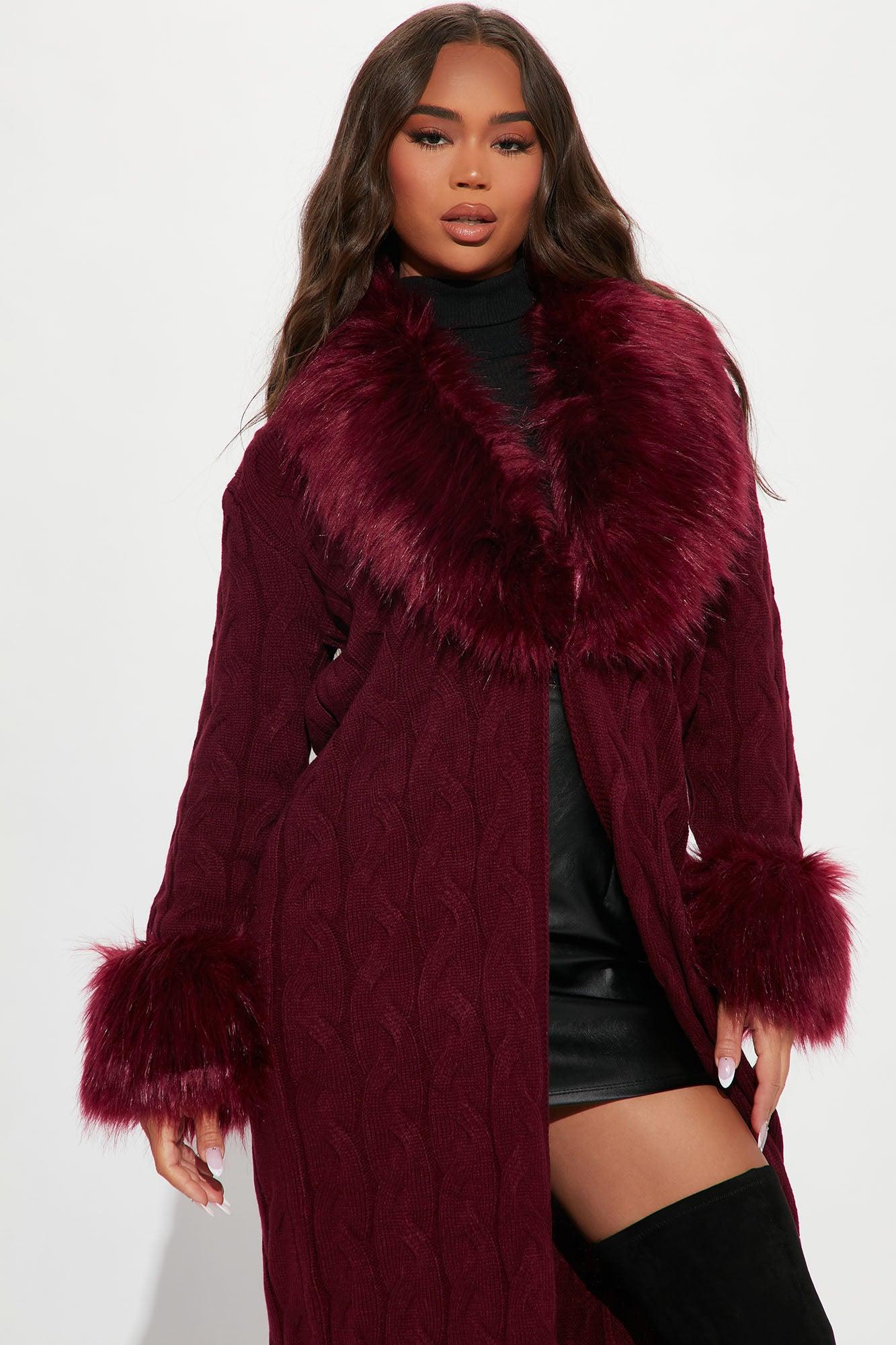 Available In Burgundy. Cardigan Sweater Coat Cable Knit Duster Length Long Sleeve Hook And Eye Closure Faux Fur Trim Collar & Cuff Collar Self: 100% Acrylic Fur/Lining/Filling: 100% Polyester Imported California Proposition 65WARNING: Cancer and Reproductive Harm - www.P65Warnings.ca.gov.