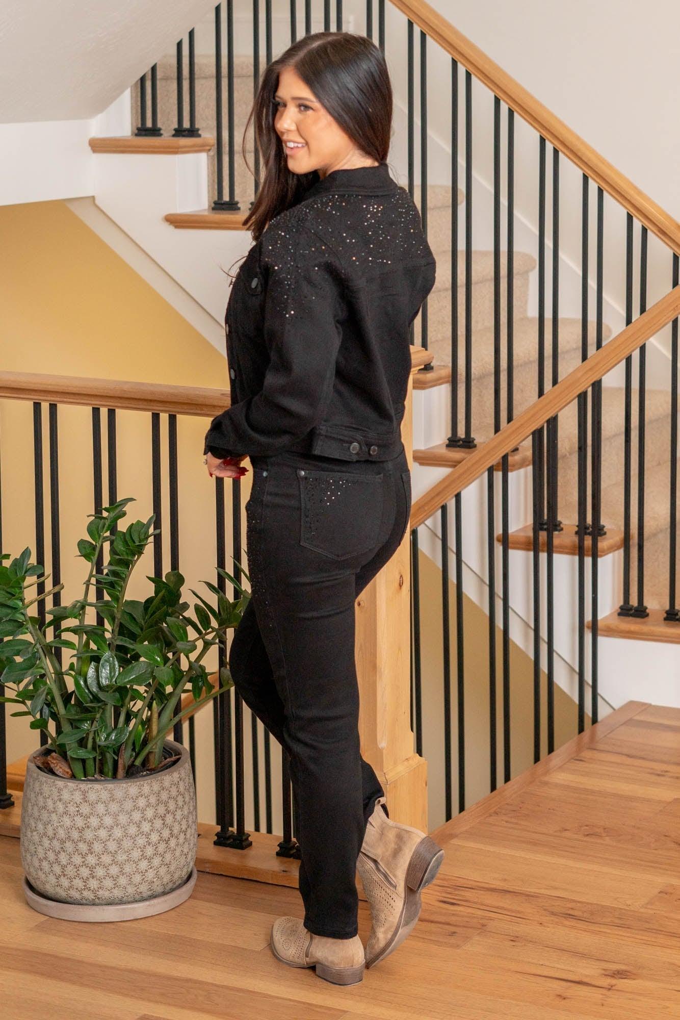 Sprinkle some charm into your wardrobe with our adorable Rhinestone Delight Jacket in playful black stretchy fabric! This jacket isn't just about looking good; it's about sparkling with joy. The rhinestone detailing adds a touch of magic, making it perfect for adding a dash of cuteness to your outfits. Comfortable and stylish, it's your go-to for turning any day into a whimsical adventure!