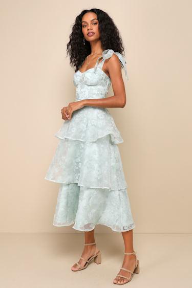 And the best-dressed award goes to…No other look can compare to this endlessly elegant jacquard dress. A floral burnout design adorns the bustier-inspired bodice with seamed cups (and supportive boning), long tying straps, and the tiered, A-line skirt that finishes at a modern midi hem. Hidden back zipper/clasp.