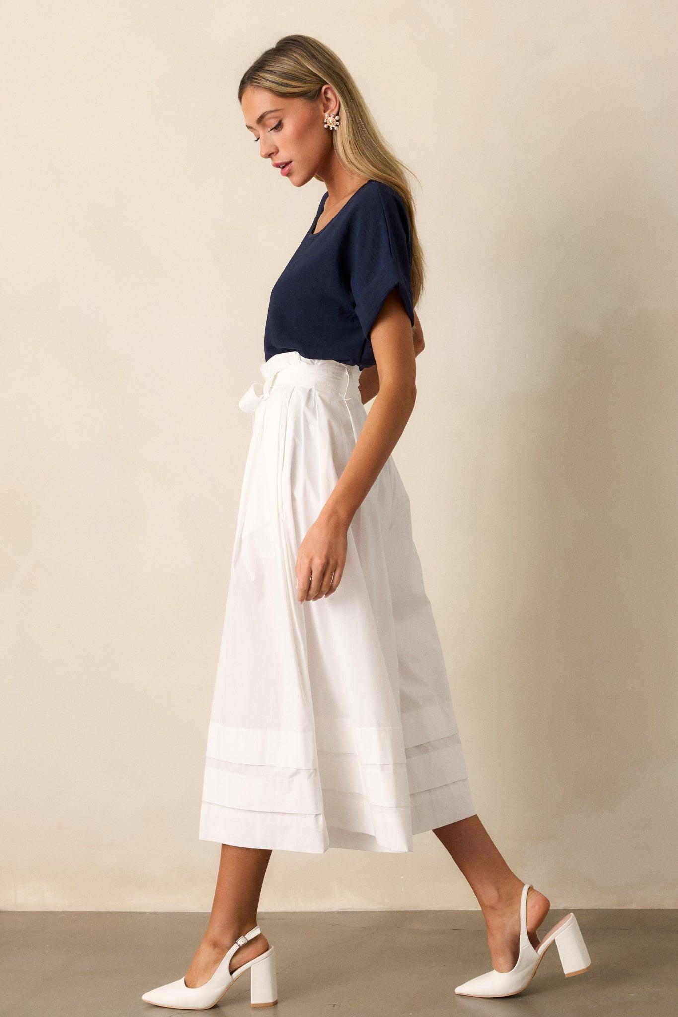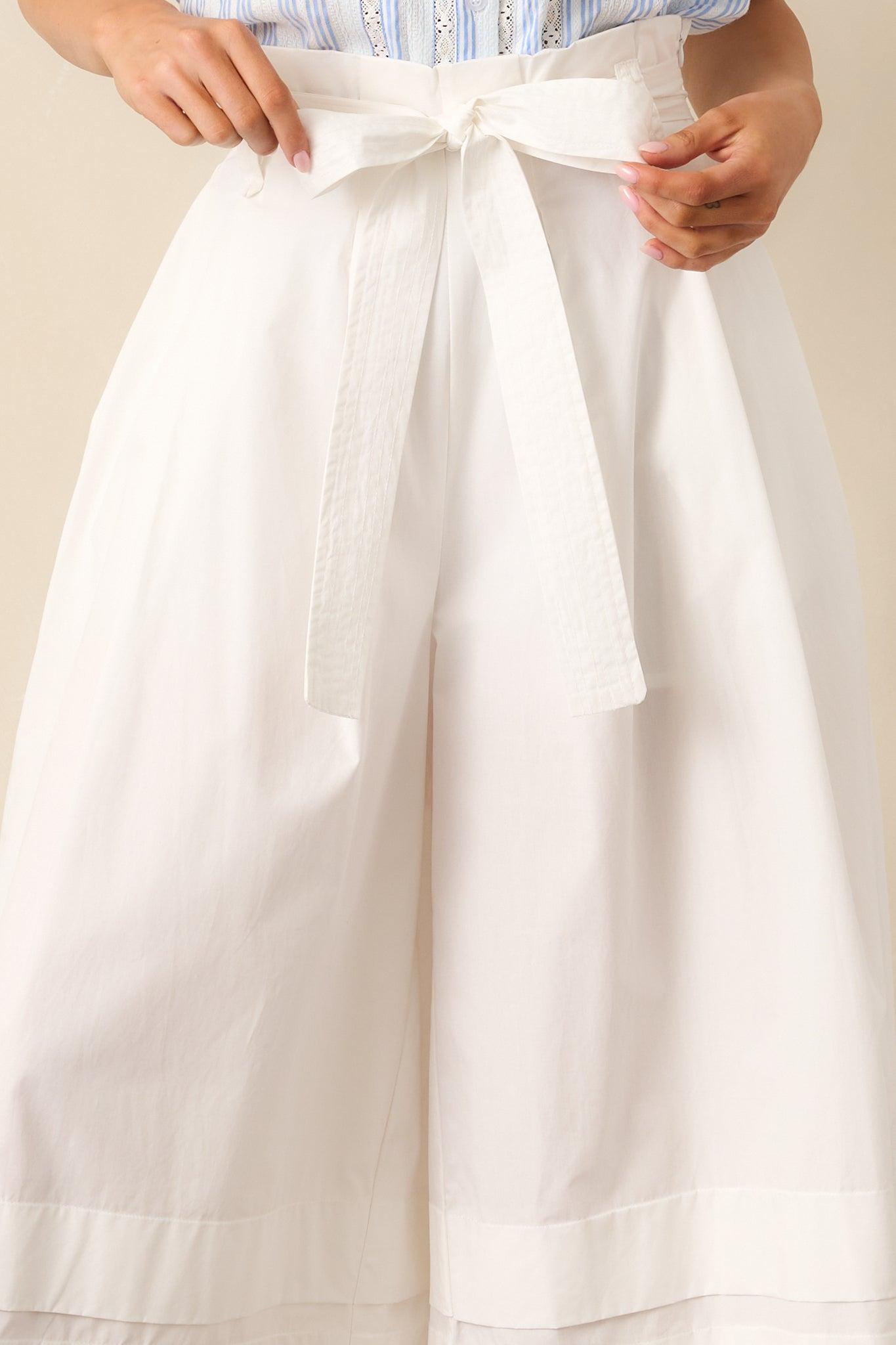 These Glimpse In Time 100% Cotton White Palazzo Pants are the perfect combination of style and comfort. With a wide leg design and cropped length, these pants will keep you looking stylish while also allowing for easy movement. The timeless white color is versatile and pairs well with any outfit. Stay in fashion with these unique and playful pants! These pants feature a high waisted design, a discrete side zipper, belt loops, a self-tie belt, functional pockets, a thick & folded hemline, and an extremely wide leg.