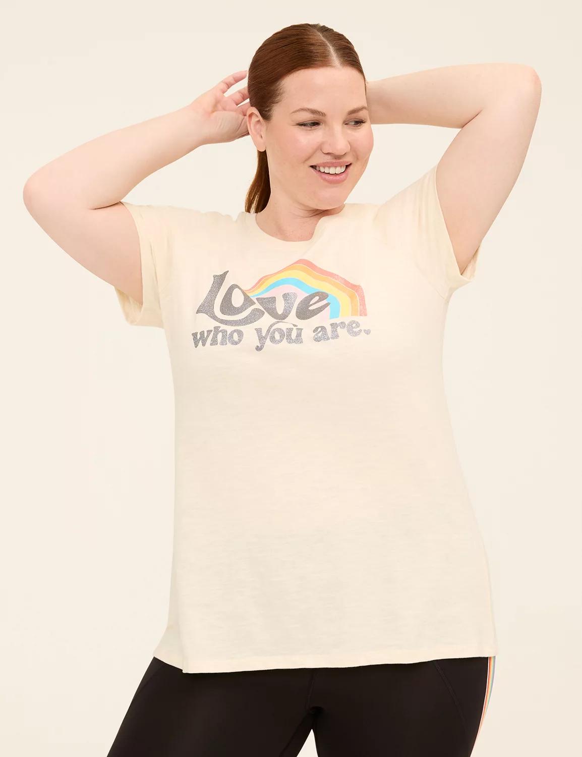 Available in Plus Size A so-soft tee with an important message - a love who you are graphic. A perfect way to show your pride all year long. FIT: Classic. Designed for curves and a not-too-tight, not-too-loose, just-right fit. Front Body Length From Shoulder: 31 (On Size 18) Longer length is perfect for added coverage. FEATURES: Crew neck Short sleeves Ribbed neckline SPECIAL DETAIL: Glitter graphic FABRIC: Soft, breathable slub jersey knit Machine Wash 60% Cotton/40% Polyester Item Number #4