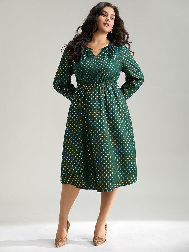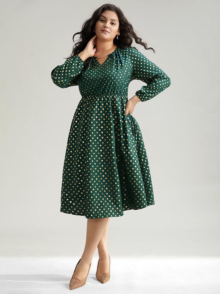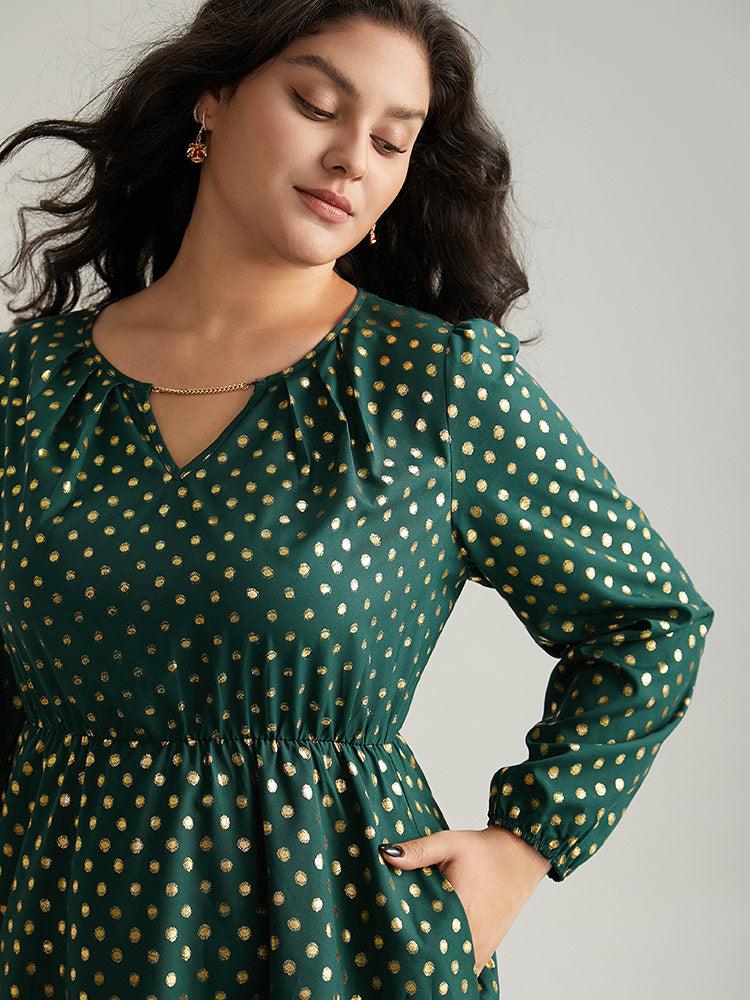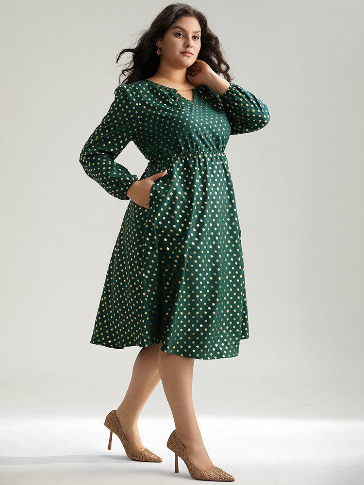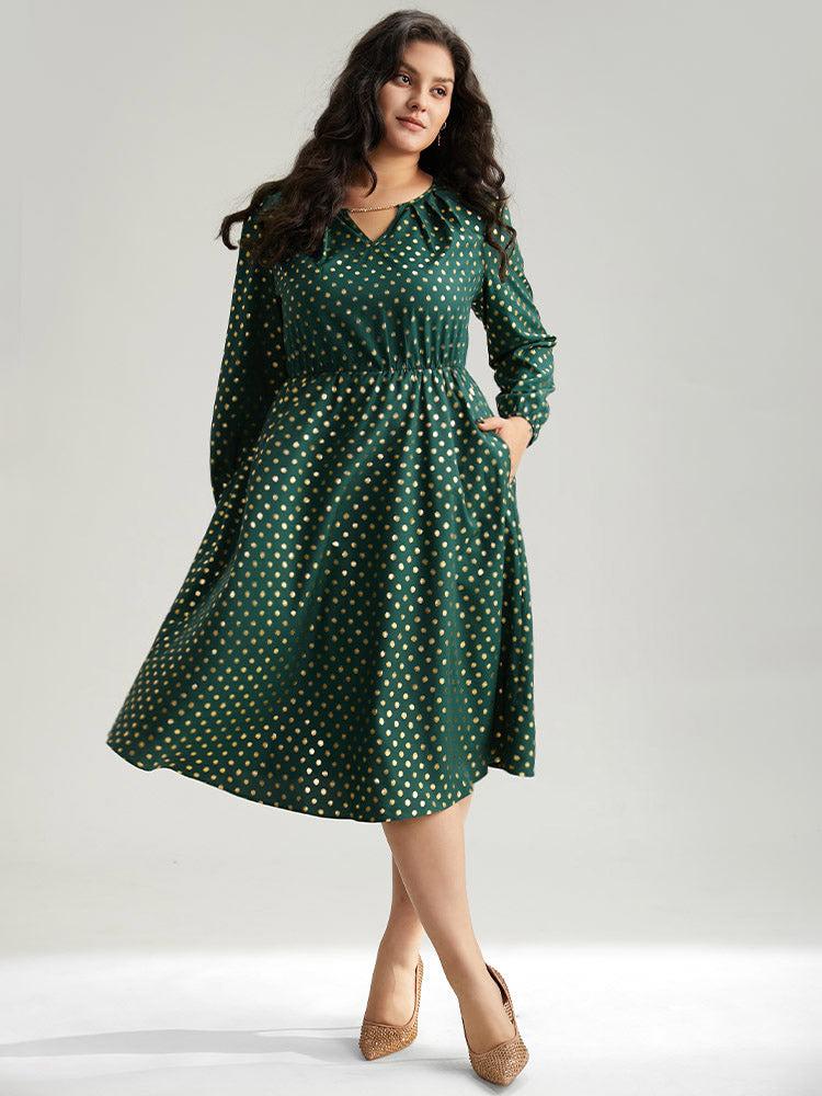 Shop Glitter Polka Dot Notched Elastic Cuffs Dress now and redefine your style with confidence at BloomChic. Tailored for mid and plus-size women. This trendy Dress, sizes 10-30. You can never go wrong with BloomChic Dresses. Season:Winter;Color:DarkGreen;Style:Elegant;Neckline:Notched collar;Sleeve Type:Lantern Sleeve;Pattern Type:Polka Dot, Graphic-Christmas;Details:Pocket, Elastic Waist, Printed, Gathered, Elastic cuffs;Pocket:It is perfectly sized to carry a phone.;Belt:No-belt