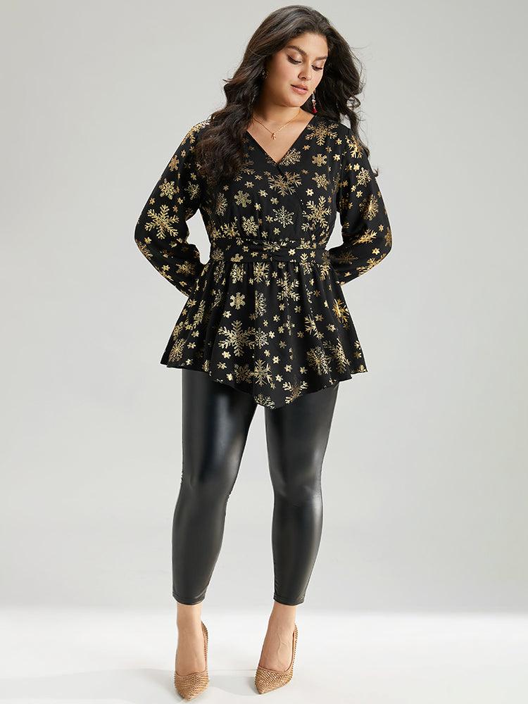 Shop Glitter Snowflake Elastic Waist Ruched Wrap Blouse now and redefine your style with confidence at BloomChic. Tailored for mid and plus-size women. This trendy Tops Women, sizes 10-30. Season:Winter;Color:Black;Pattern Type:Graphic-Christmas;Neckline:Overlap Collar;Sleeve Type:Lantern Sleeve;Details:Elastic Waist, Printed, Ruched, Elastic cuffs, Asymmetrical;Pocket:No-pocket;Snap Fastener:Snap fastener