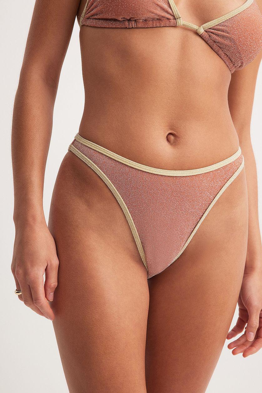 This bikini panty is glittery and features a high cut leg. It has contrast-colored hemlines and a lining.