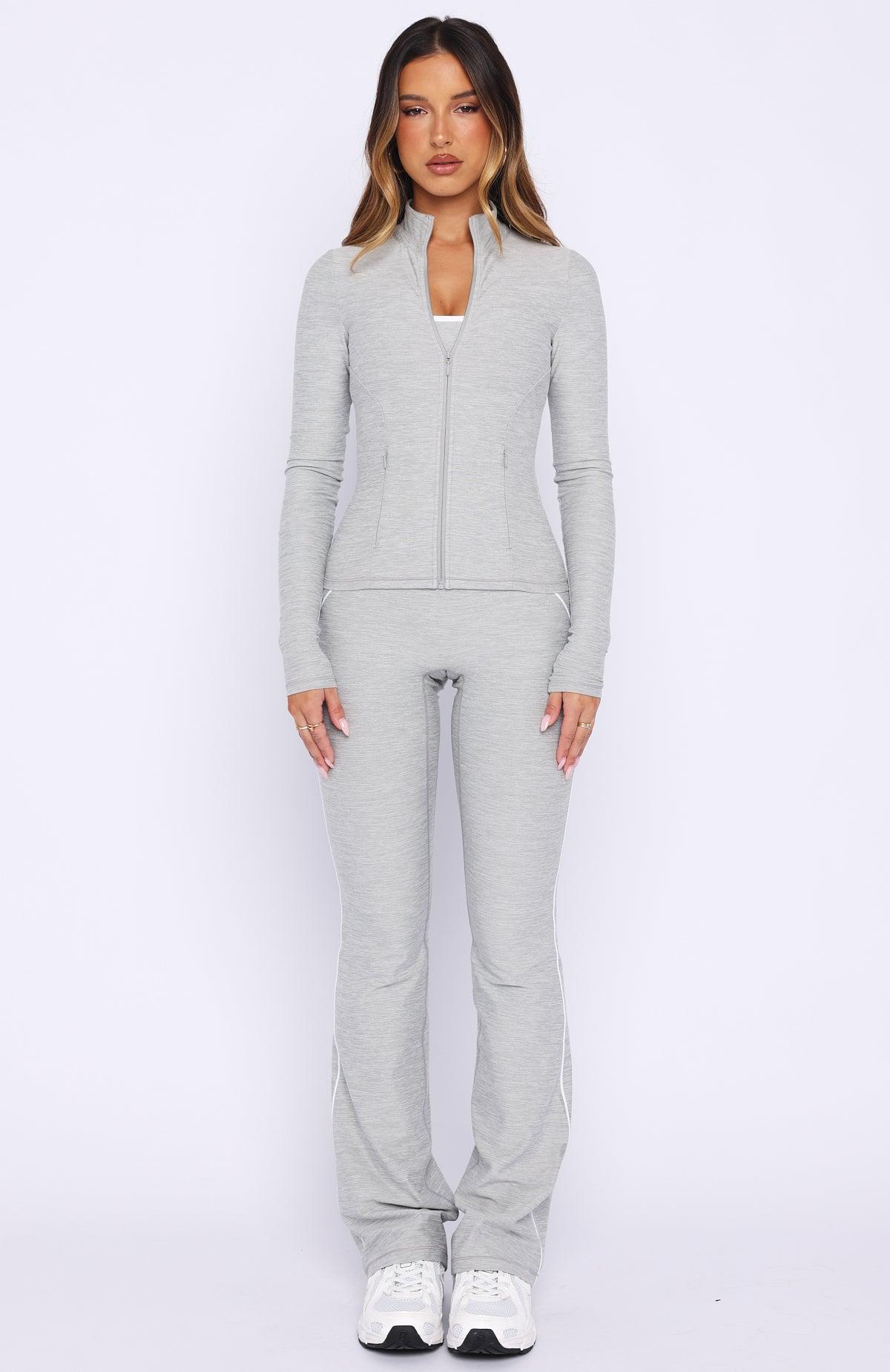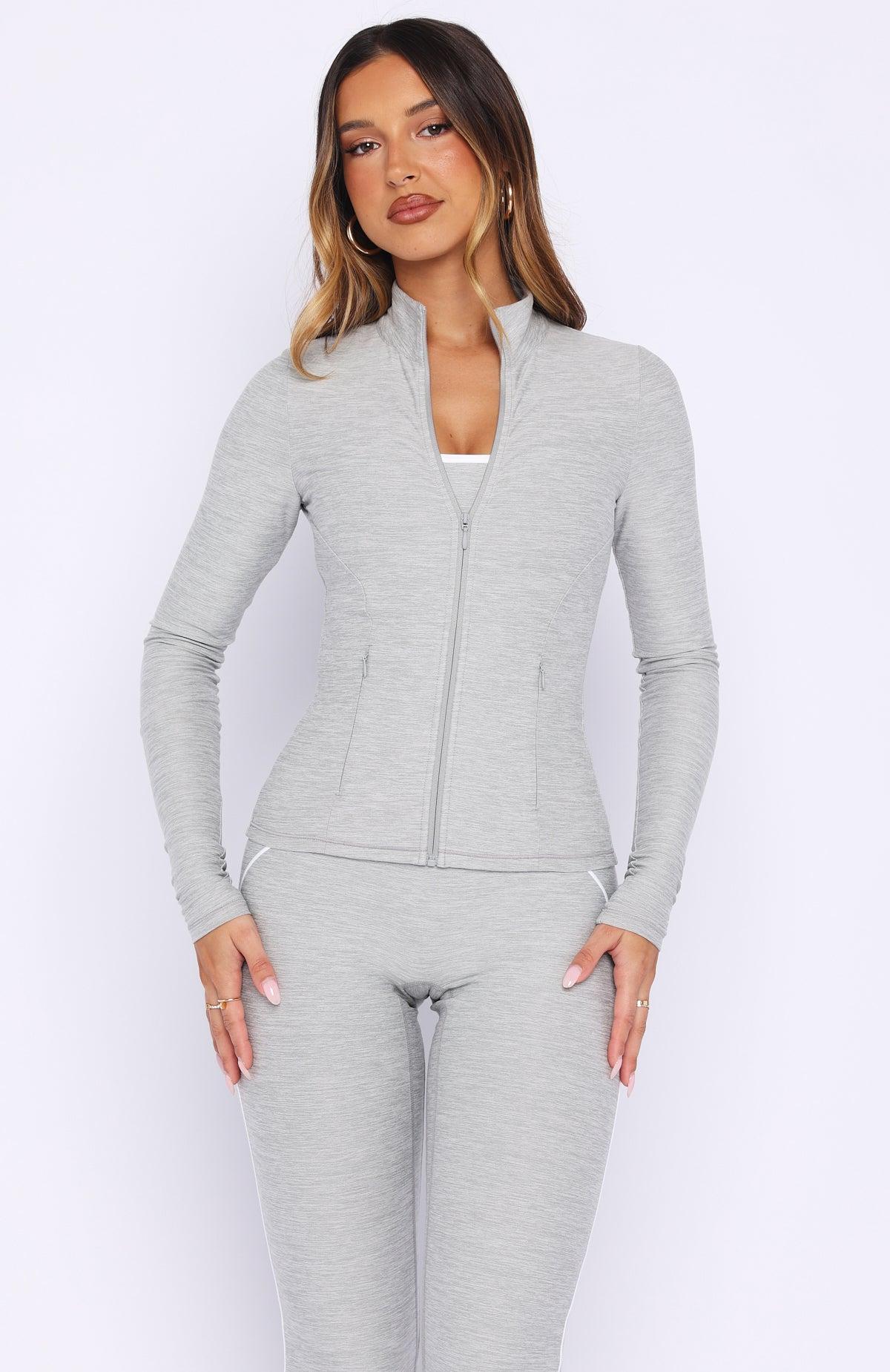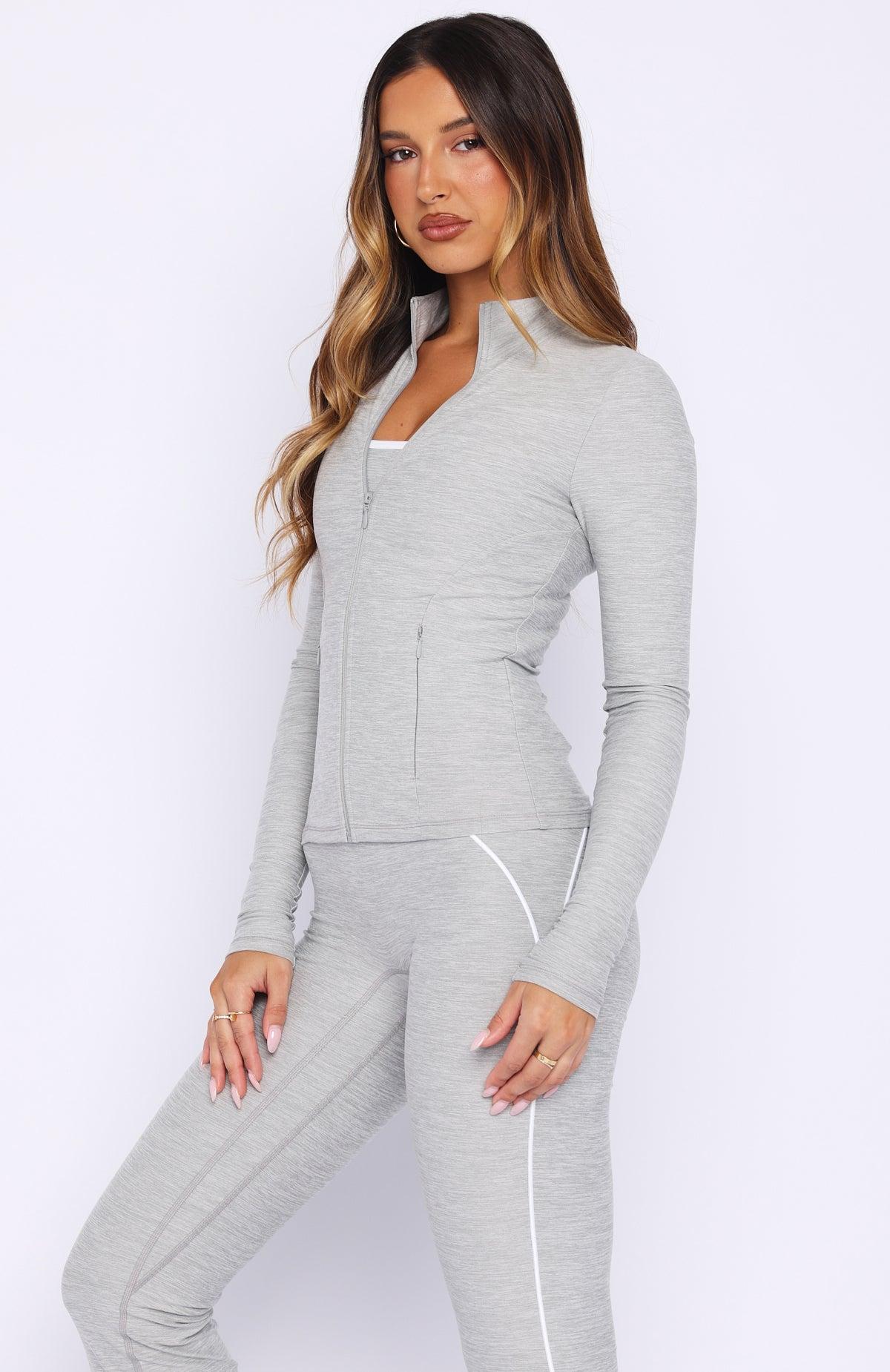 WHITE FOX ACTIVE Matchy-matchy style meets performance in the Glory Jacket in Grey Marle. It features a high neckline, long sleeves, fitted silhouette, centre front zipper, and side pockets with invisible zipper closures. Made from high-stretch fabric and unlined for flexible comfort. It pairs perfectly with the matching Challenge Leggings, Sprintline Bike Shorts 4", or Volt Flare Leggings.