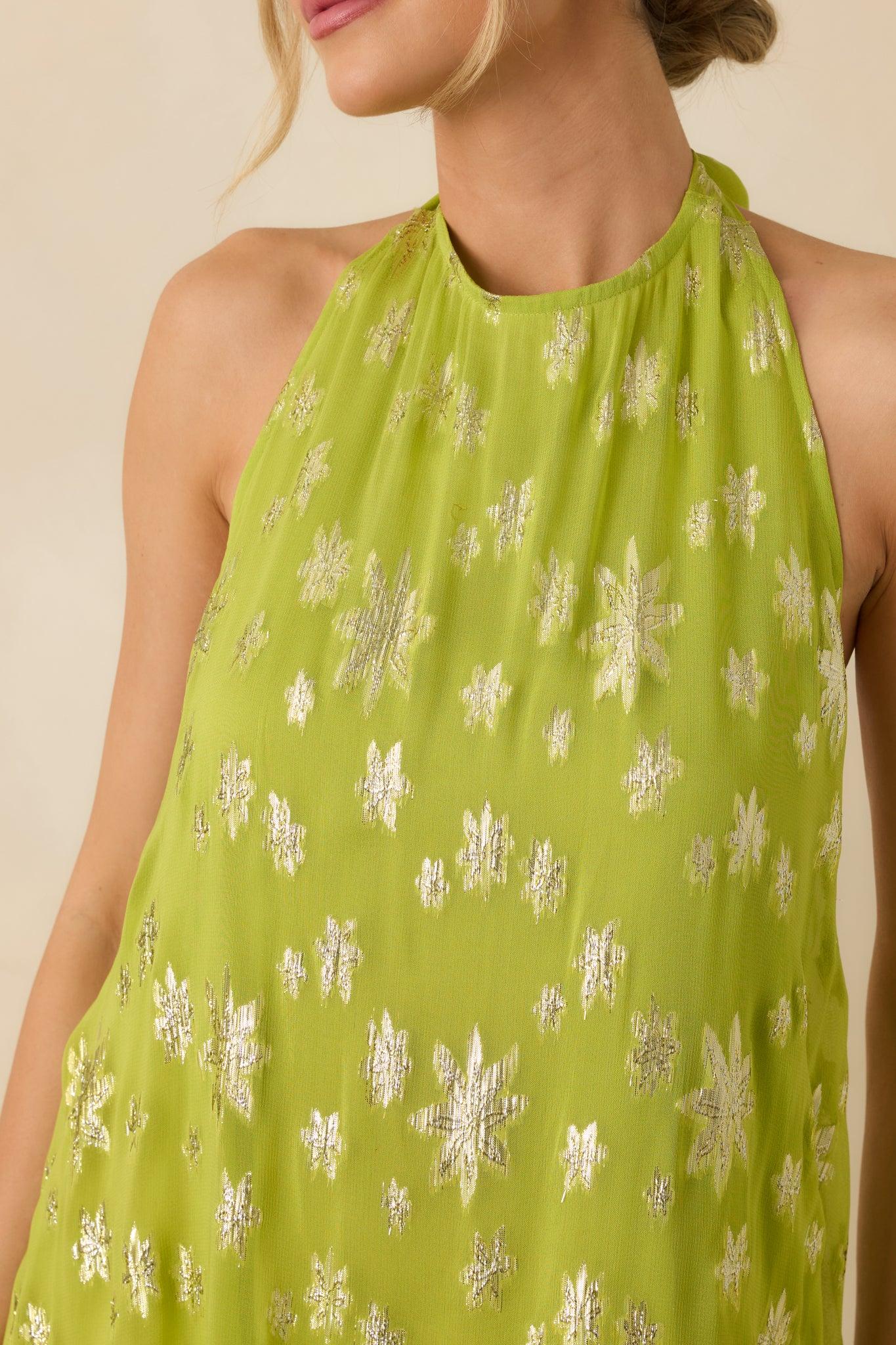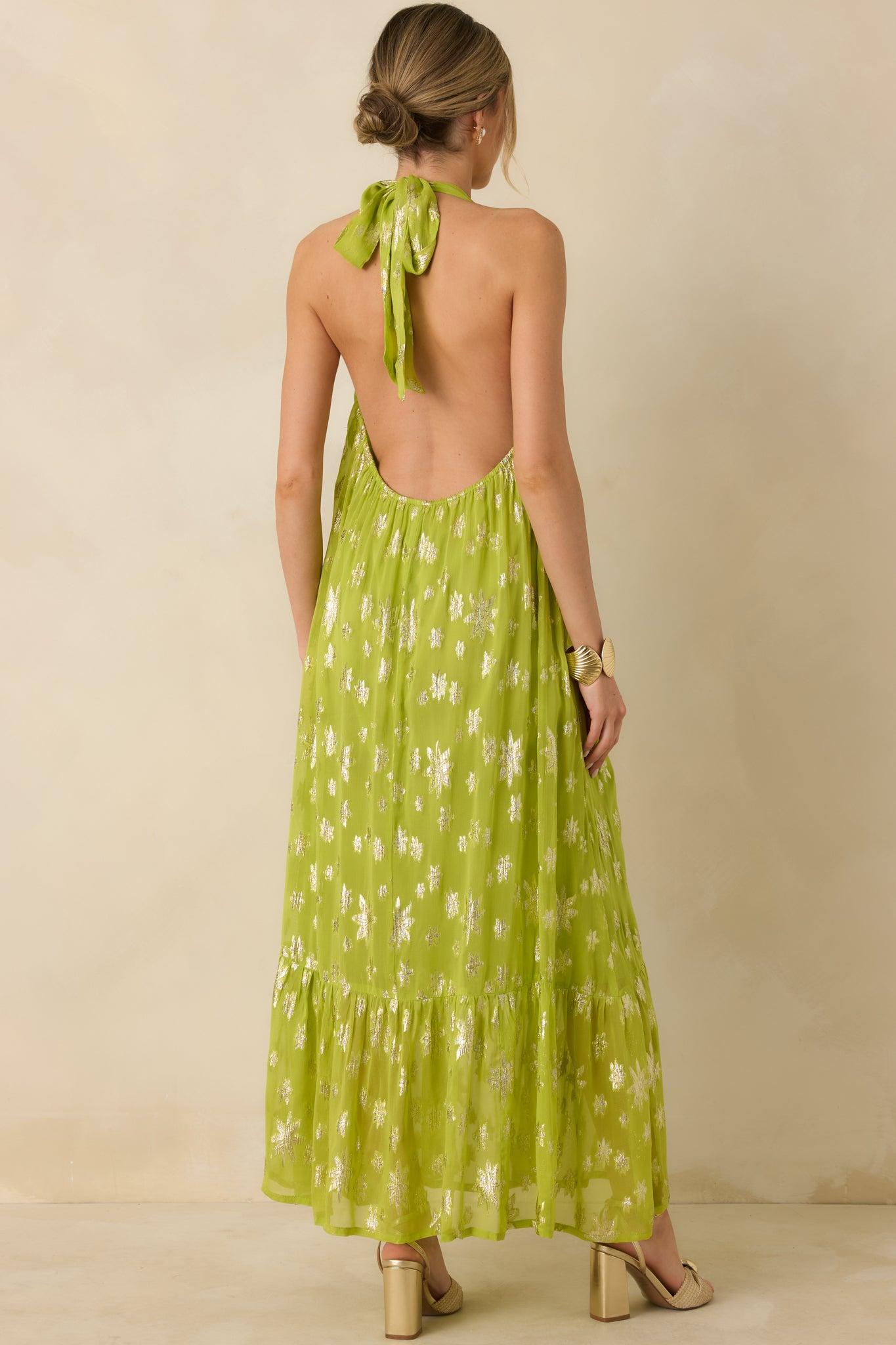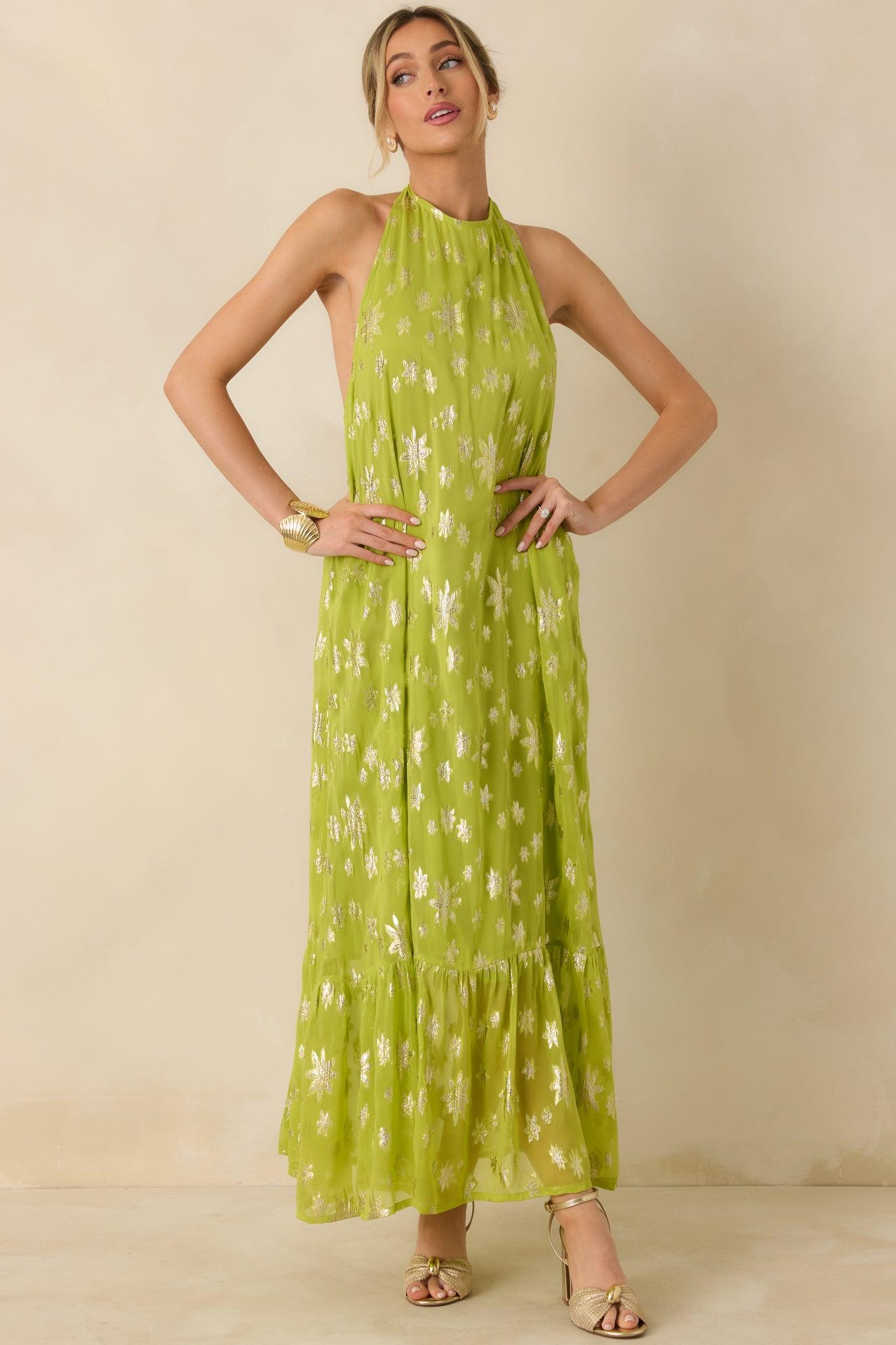 Glow With Grace Chartreuse Metallic Floral Halter Maxi Dress is the kind of dress that quietly steals the spotlight. The chartreuse hue catches the light beautifully, while metallic floral details add just enough shimmer to feel special. With its flowing shape and soft movement, it’s made for warm evenings, memorable entrances, and moments that deserve a little extra glow. This chartreuse maxi dress features a fully lined lightweight woven fabric with metallic floral detailing throughout. Designed with a halter neckline that ties at the back, it showcases an open back with elastic smocking for a comfortable, flexible fit. The relaxed silhouette flows into a tiered maxi-length skirt for added movement and ease. 80% Viscose & 20% Metallic Lining: 100% Cotton Hand Wash Cold Manufactured in India Designed in The USA Model is 5'8" and Wearing a Size Small, Clipped, Model is a True X-Small