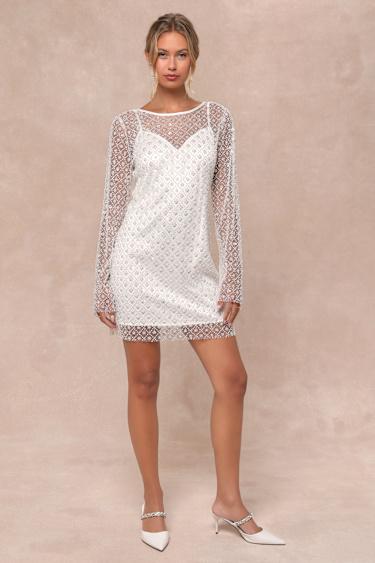 You know how to shine all on your own, but with the Lulus Glowing Charisma White Sequin Pearl Mesh Long Sleeve Mini Dress, you'll effortlessly sparkle! Glittery sequins, dainty beads, and gleaming faux pearls embellish a sheer mesh overlay that shapes a crew neckline, a sheer décolletage, and long sleeves. The matching satin lining features adjustable spaghetti straps, a V-neckline, and a figure-skimming sheath silhouette that finishes at a sultry mini hem. Hidden zipper/clasp at back.