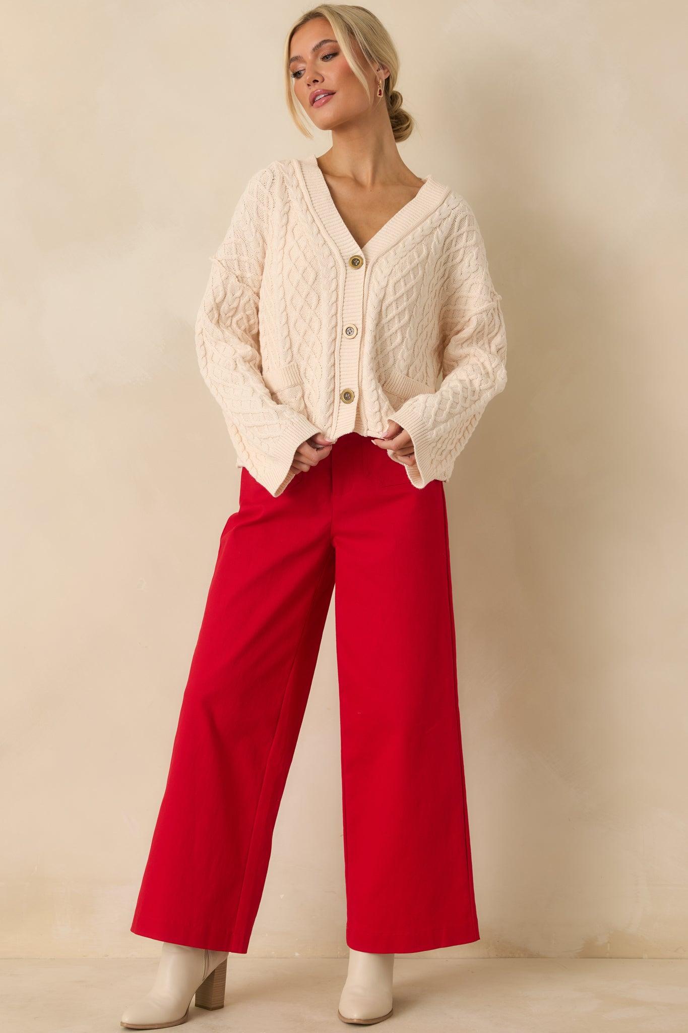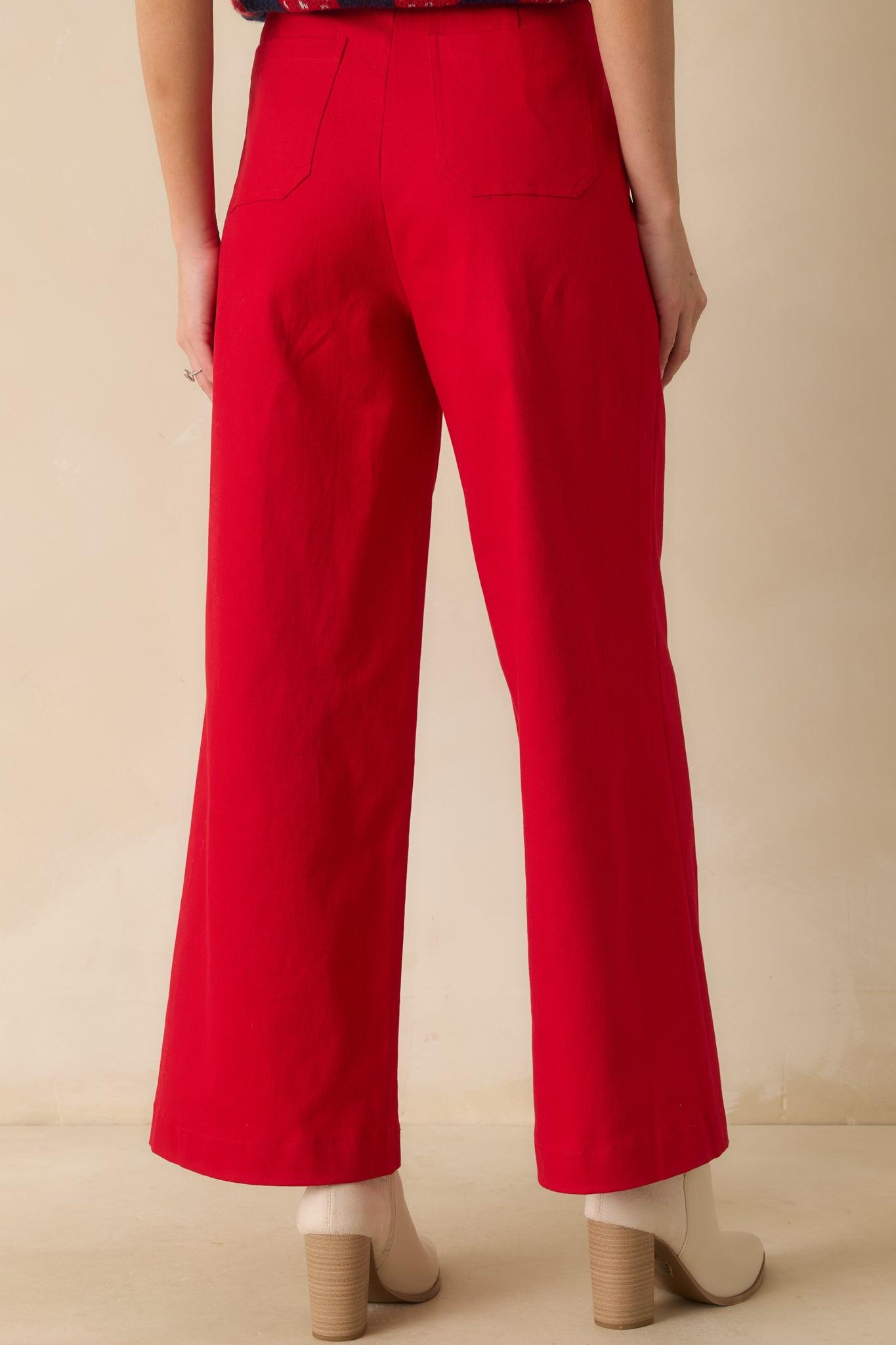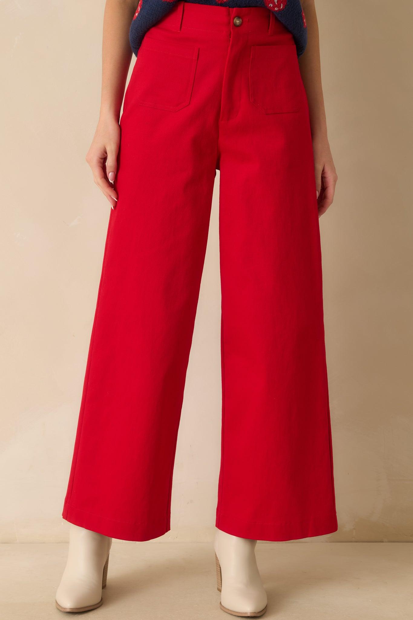 The Go Boldly Red Wide Leg Jeans bring a fearless pop of color to your everyday style. Striking yet effortless, they’re the perfect pair for standing out while keeping it classic. These red jeans feature a high-rise waist, wide-leg silhouette, front patch pockets, back pockets, belt loops, and a button-zip fly closure, made from structured cotton-blend denim for a flattering, polished fit. 97% Cotton & 3% Spandex Unlined Hand Wash Cold Manufactured in China Designed in The USA Model is 5'8" and is Wearing a Size Small