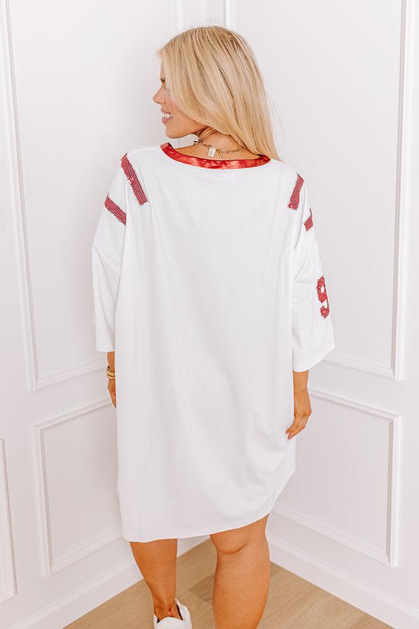 - Activate game day mode with this trendy mini dress! It's effortlessly stylish sequined design adds the perfect amount of sparkle. Bring glam to the game with this adorable dress. Get the Game Day essentials for the Alabama Crimson Tide, Arkansas Razorbacks, Arkansas State Red Wolves, Texas A&M Aggies, Texas Tech Red Raiders, University of Georgia Bulldogs, University of Oklahoma Sooners, or the University of Louisville Cardinals teams. - Sleek, stretchy faux leather material - A v-cut neckline - A sequined football jersey style design featuring '97' on the front and at the sleeves - Short, loose sleeves - A relaxed silhouette that ends in a straight mini dress length hemline - This piece is perfect for fans of Arkansas, Georgia, Texas Tech, Alabama, Oklahoma, and more!