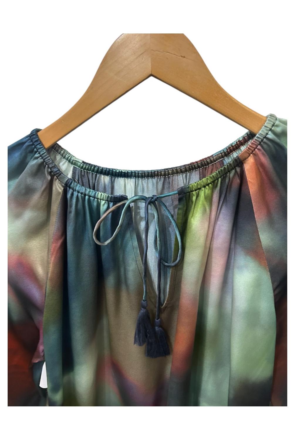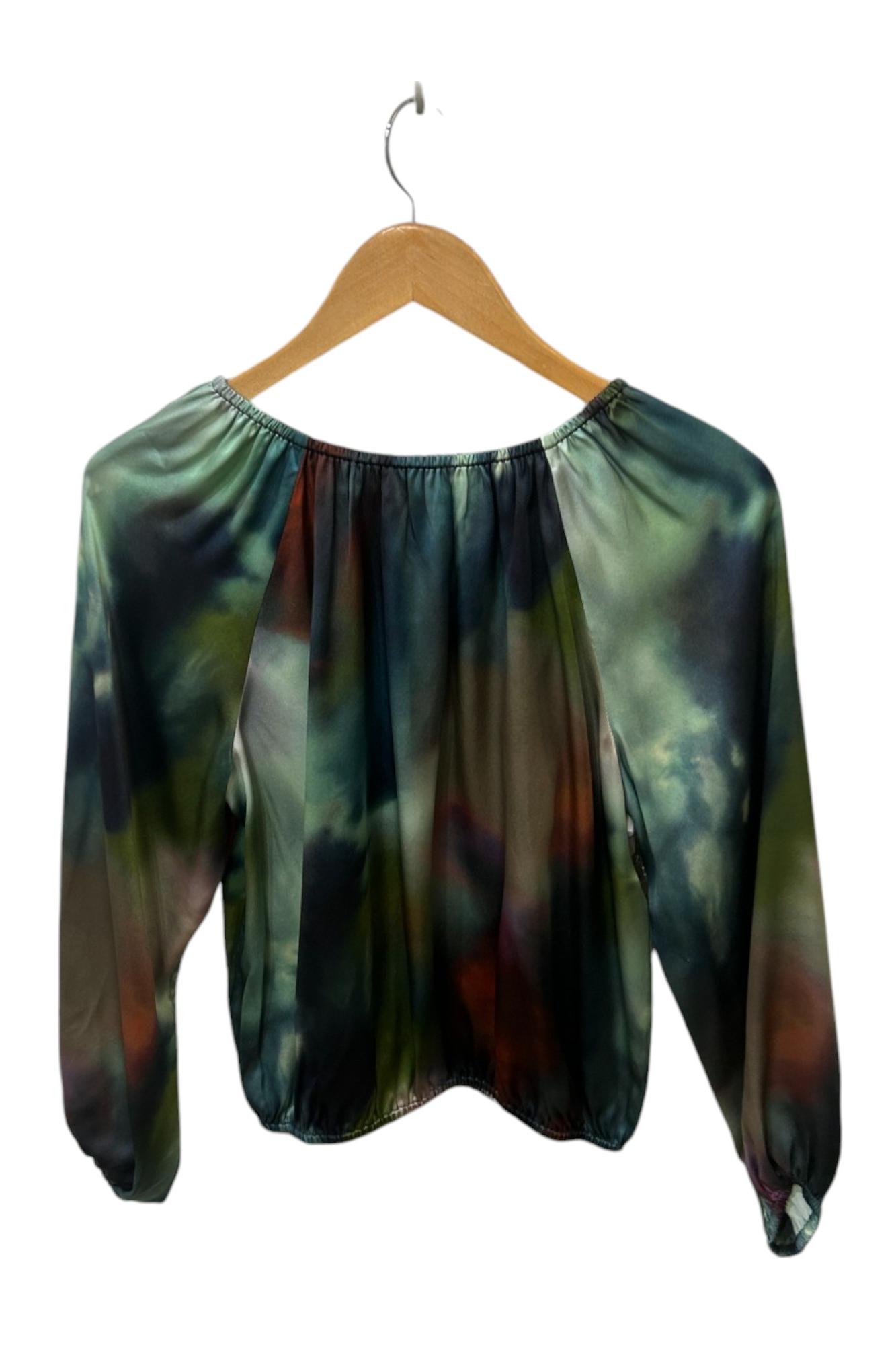 Elevate your wardrobe with this effortlessly chic **Go Silk** blouse, crafted from **luxuriously soft, machine-washable silk**. Featuring a **flowy, relaxed silhouette**, this top boasts an **off-the-shoulder elastic neckline**, allowing for versatile styling. The **long, billowy sleeves** with elastic cuffs add a touch of elegance, while the **abstract, watercolor-inspired print** in deep green, earthy brown, and hints of blue creates a sophisticated, one-of-a-kind look.