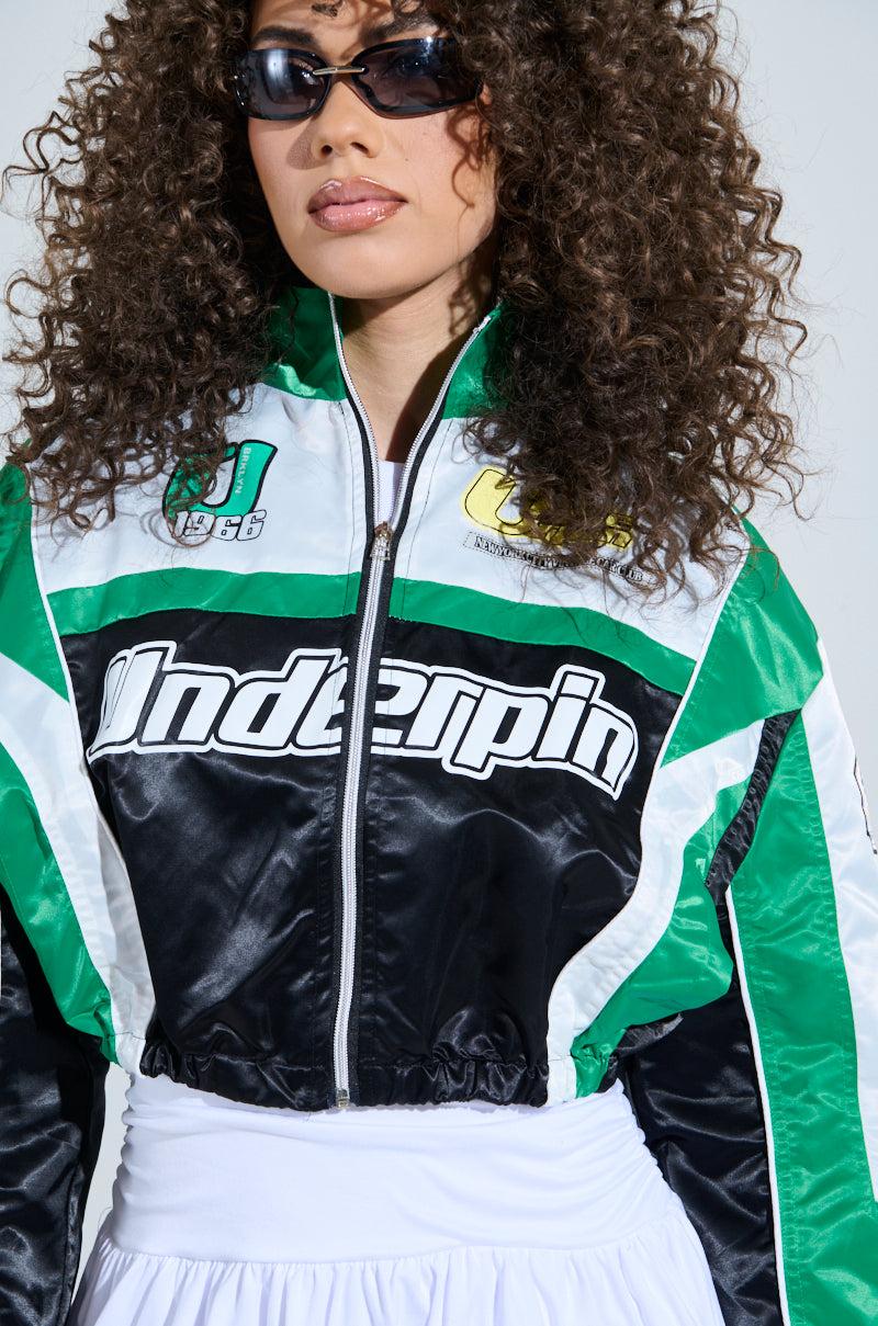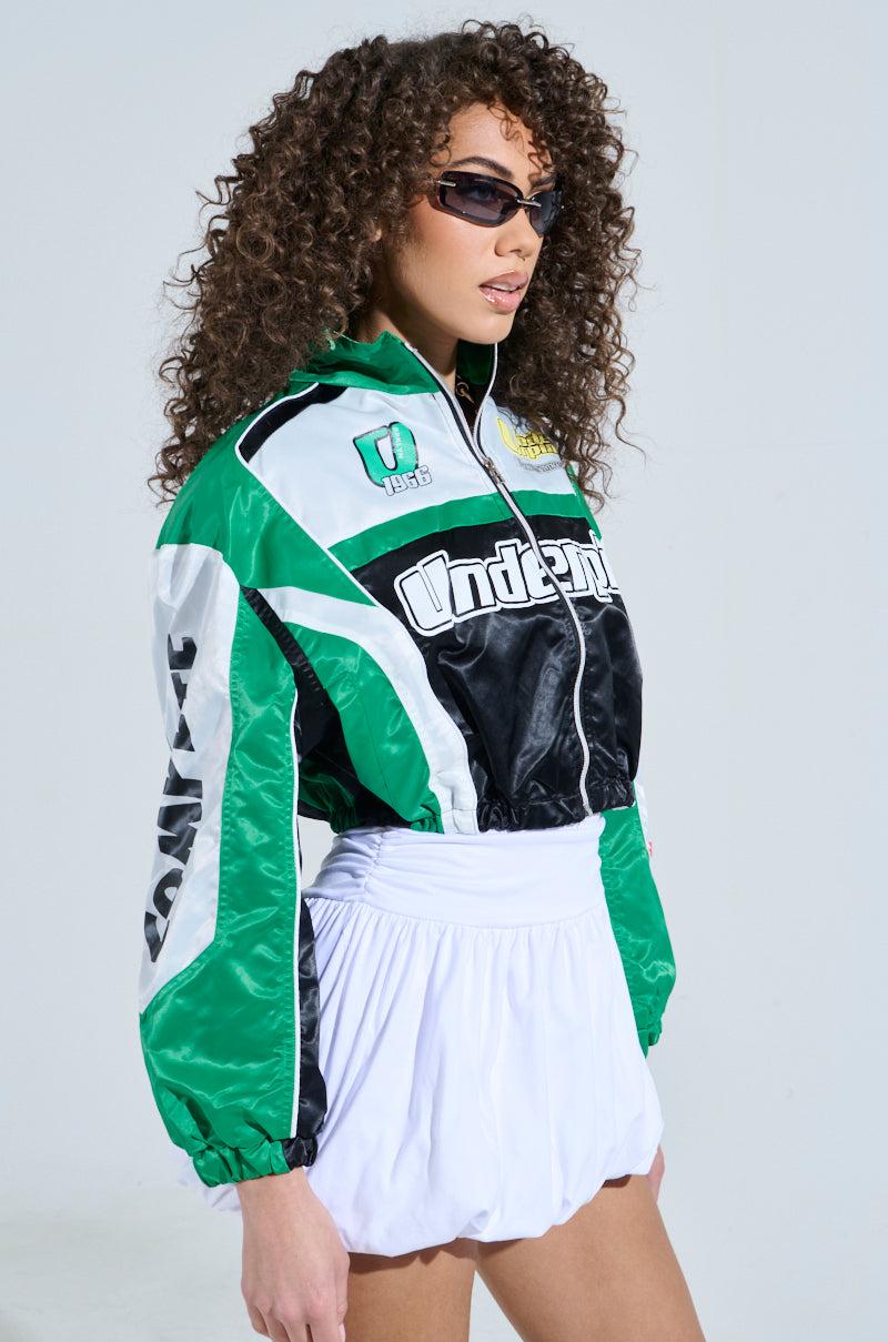 More like the fast and the fabulous! The AKIRA Label Go Time Embroidered Bomber is a lightweight jacket crafted from slick, swishy nylon. It features a cropped silhouette, a cool, color-blocked design, a stand-up collar, long sleeves with cinched, elasticized cuffs, spacious side seam pockets, an elasticized hem, and a metallic zipper front closure. Complete with slick interior lining and assorted racing-inspired graphics throughout. - Main: 100% Nylon, Lining: 100% Polyester- No Stretch- Imported (all measurements approximate from size small) - 18” Shoulder to Hem- 22” Shoulder to Shoulder- 20” Sleeves- Model is 5’10” and wearing a size smallProduct ID: 1031130