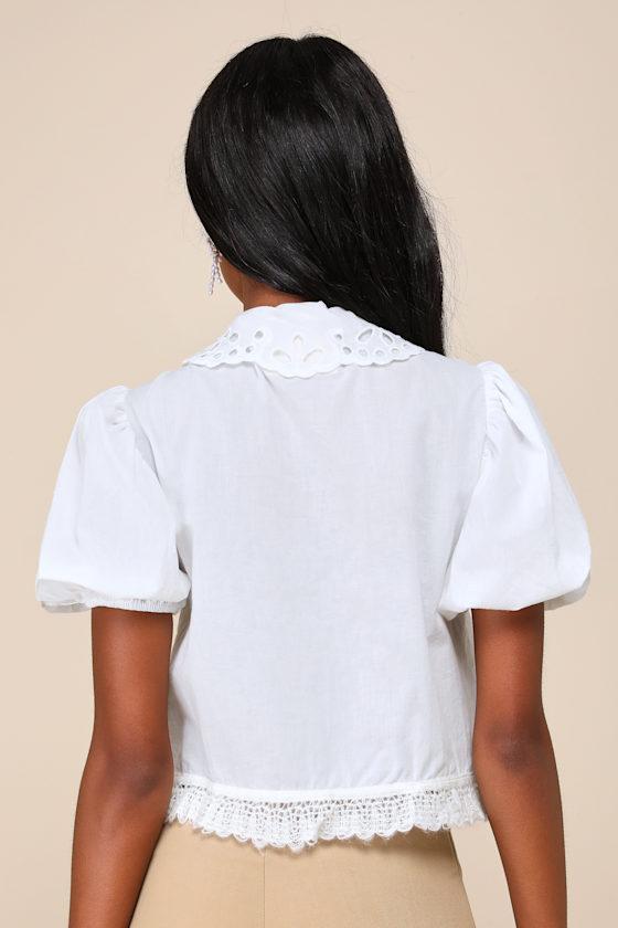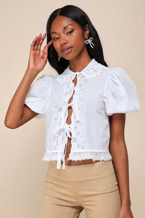 From the farm to Fashion Week, everyone's talking about the Zemeta Goat Chase White Embroidered Puff Sleeve Tie-Front Bow Top! Lightweight woven cotton shapes this dreamy, countryside-cute top that has a scalloped, eyelet-embroidered collar and short puff sleeves with elastic at the cuffs. Bodice boasts a complimentary embroidered design along the center, which secures with four tying bows— two of which are embroidered and two of which are not. Relaxed bodice ends at a band of fuzzy, crochet-like thread trim in a scalloped design.