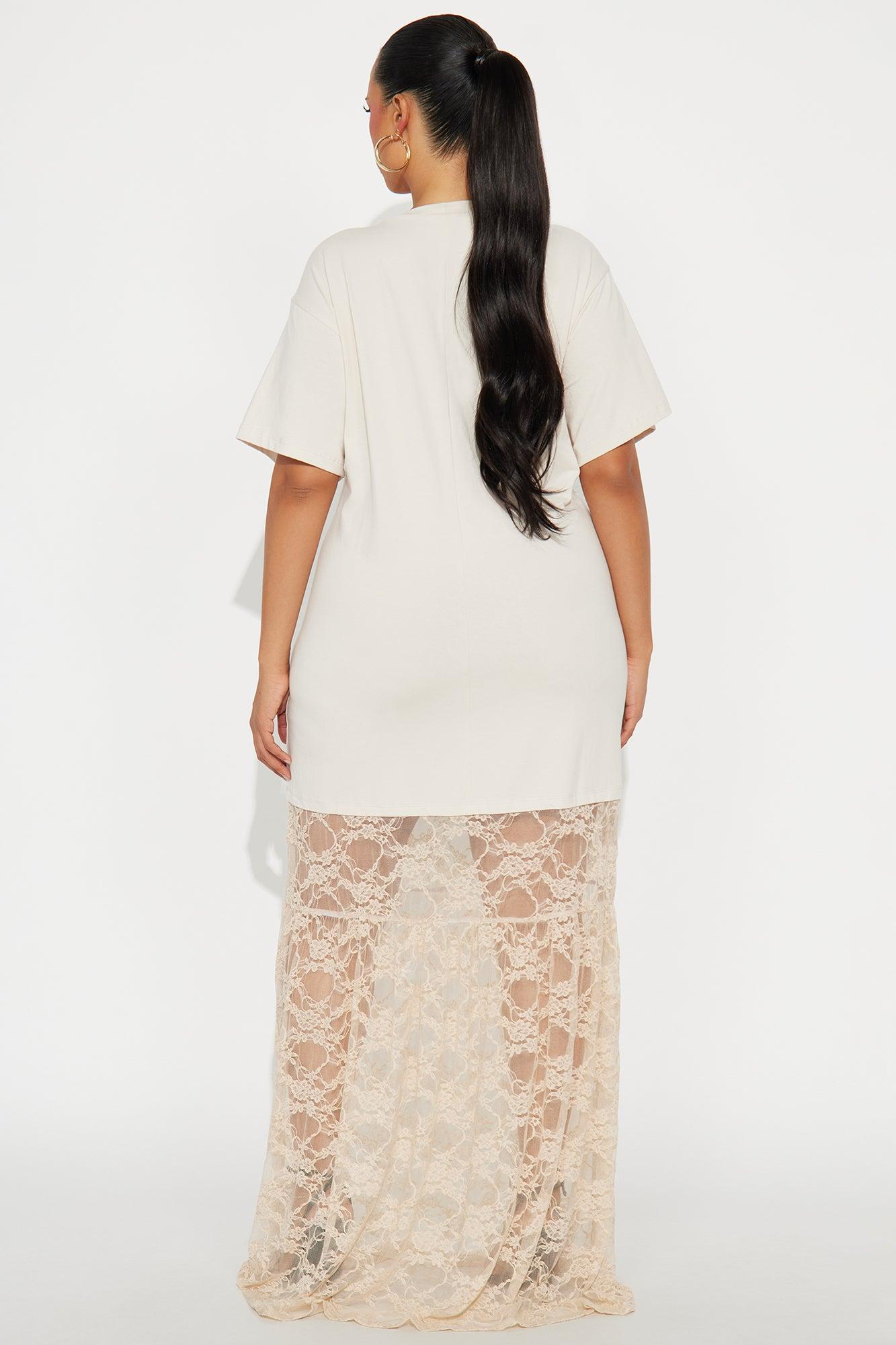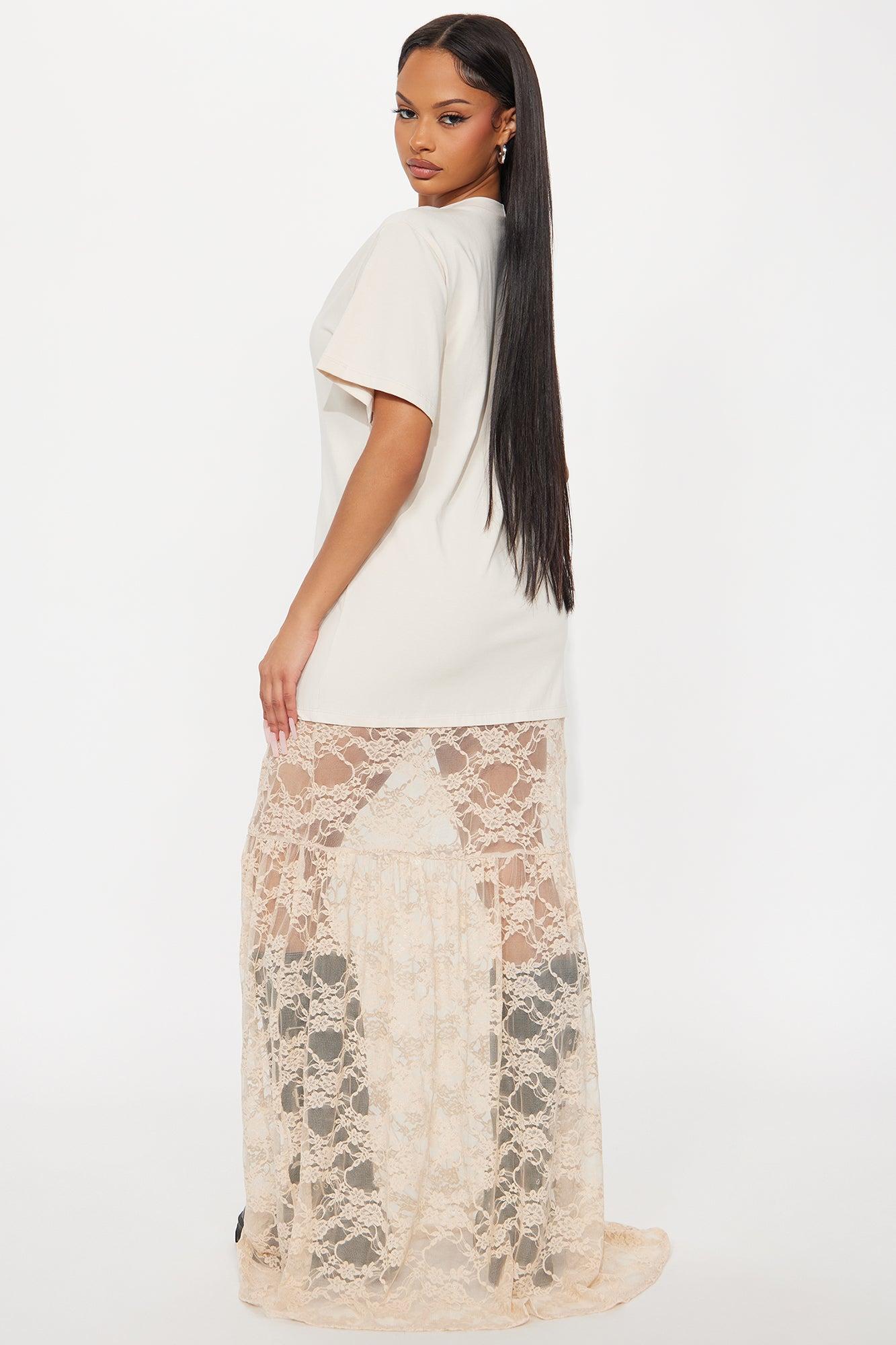 Available In Cream. Graphic T-Shirt Maxi Dress Short Sleeve High Neck Lace Skirt Sheer Stretch Self: 95% Cotton 5% Spandex Contrast: 92% Nylon 8% Spandex Imported
